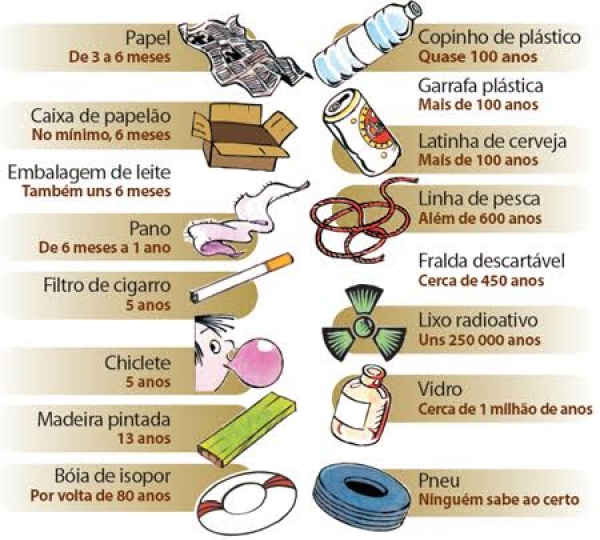 Uma garrafa pet por exemplo demora mais de 100 anos para se decompor, o vidro cerca de 1 milhão de anos, metais, cerca de 100 anos..