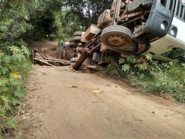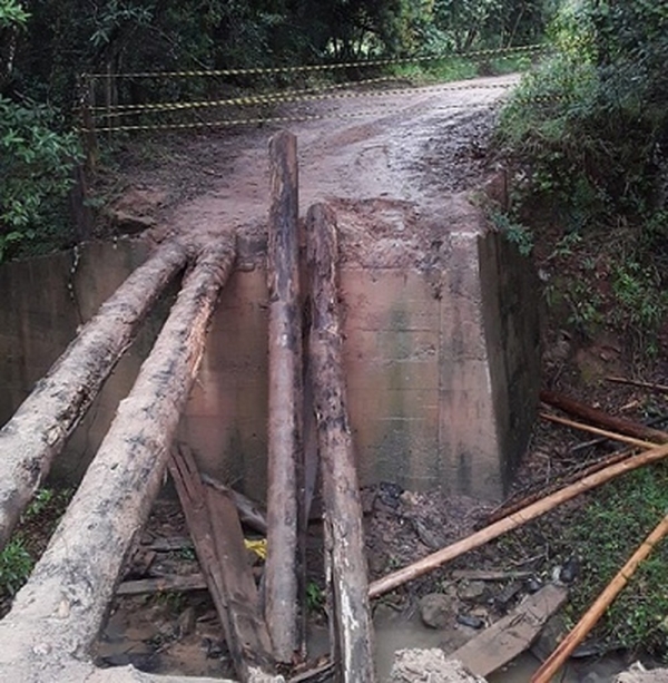 A ponte de madeira cedeu com a passagem de um veículo na última quarta-feira (08). Felizmente o motorista não se feriu.