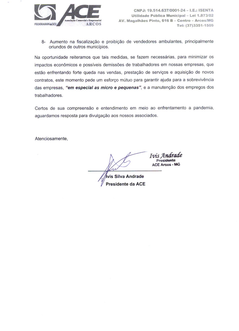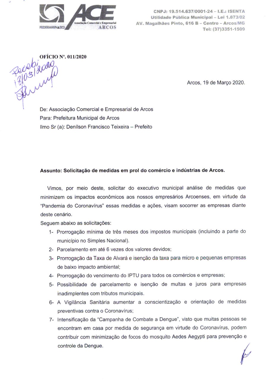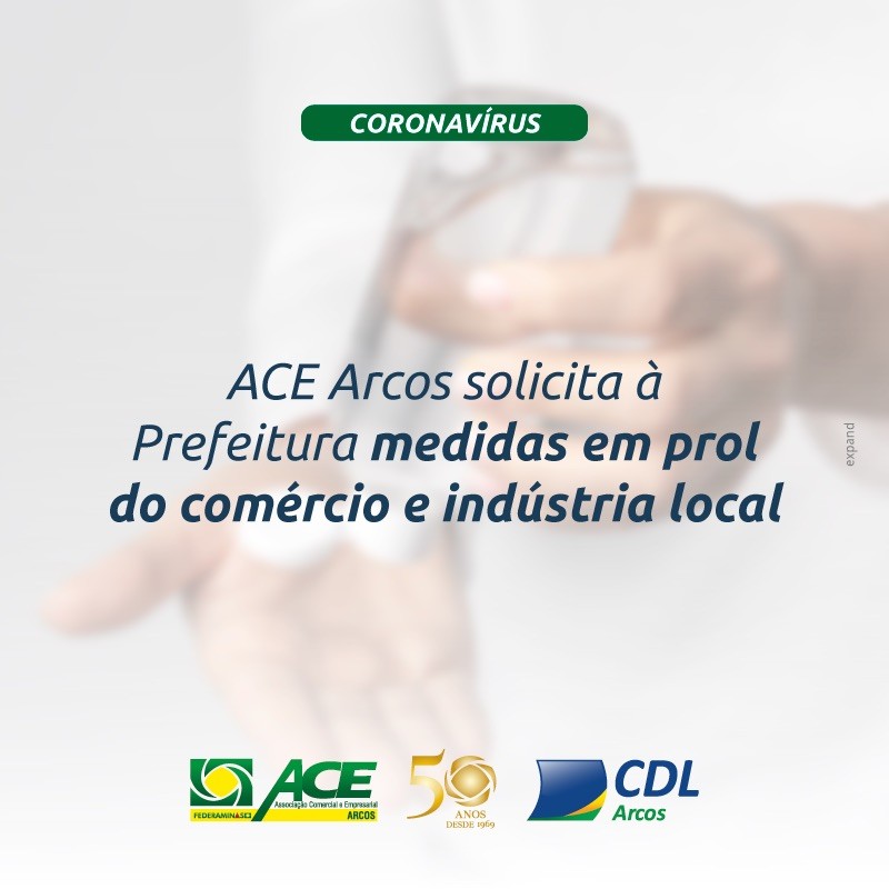 A ACE Arcos encaminhou hoje (19/03/2020) ao prefeito Denílson Teixeira um ofício em que solicita uma série de medidas para minimizar o impacto para o comércio, indústria e prestação de serviços e, principalmente, para as pequenas empresas.