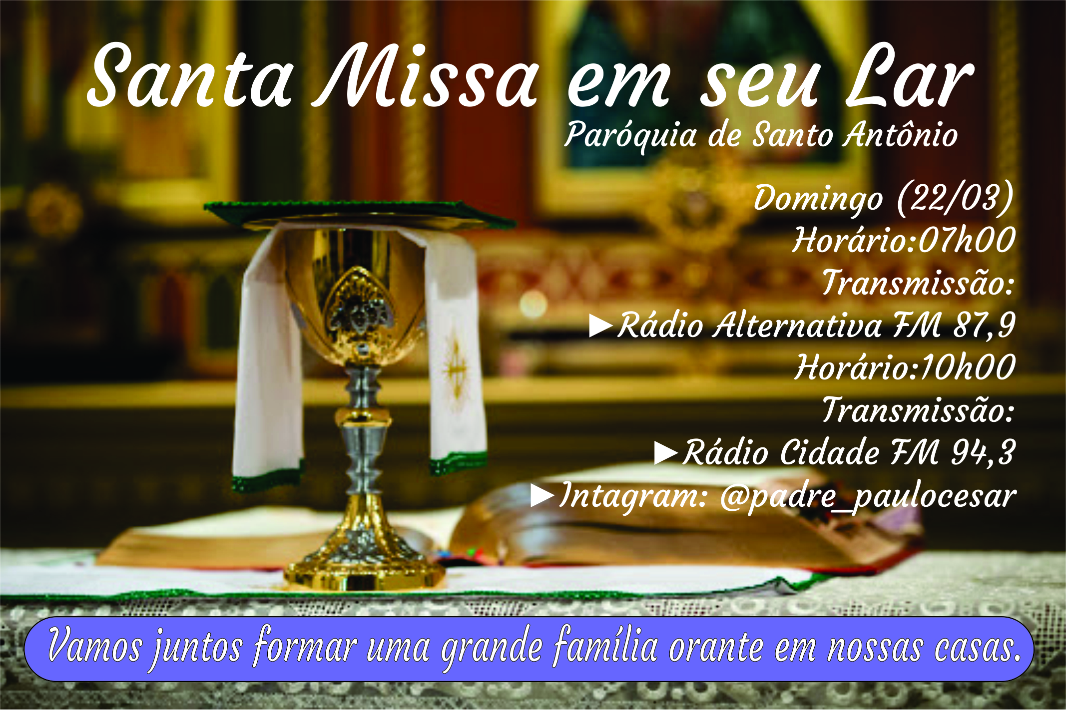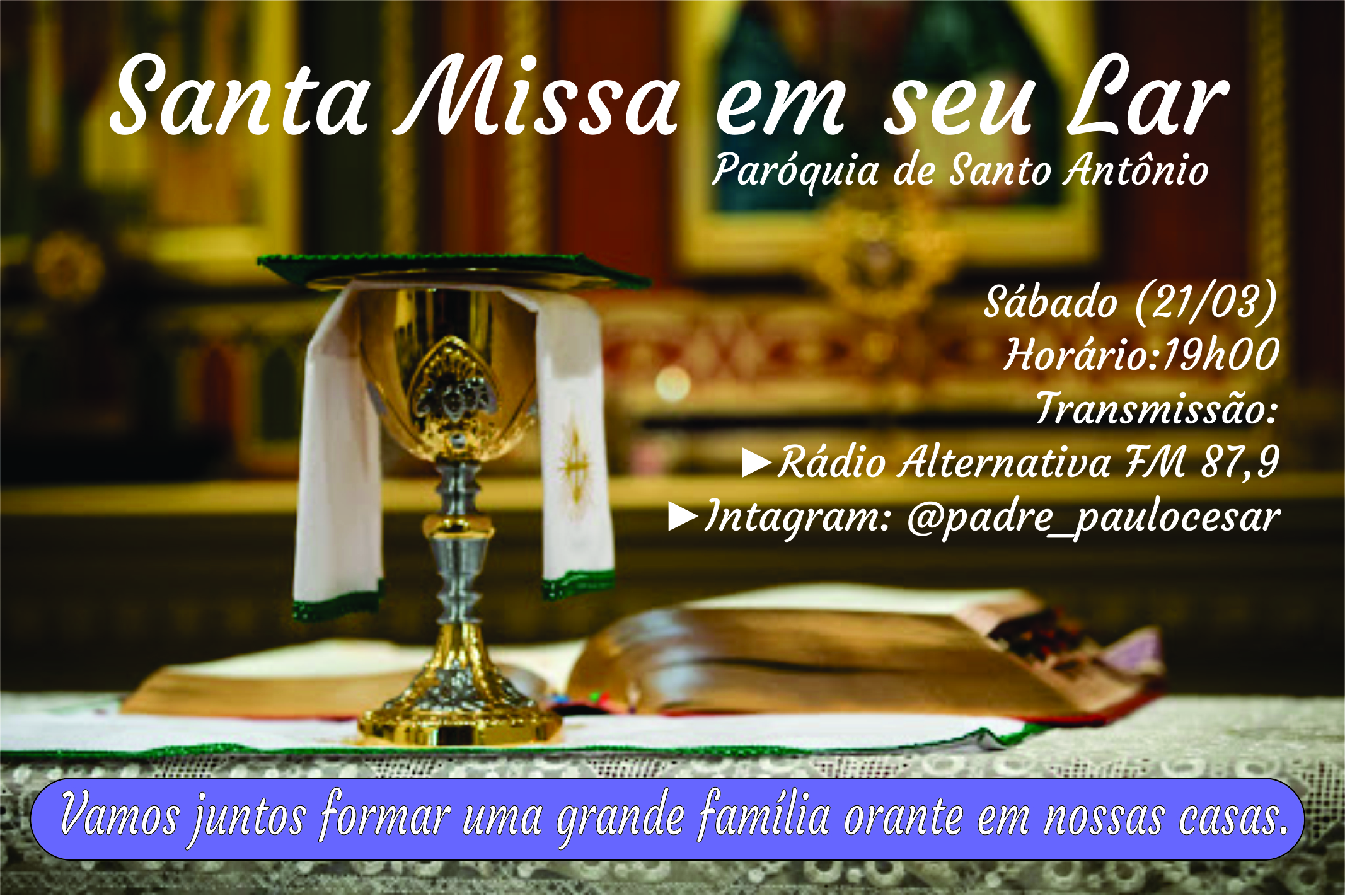 A Paróquia de Santo Antônio, através de seu Pároco Padre Paulo César informa que as Celebrações neste Sábado (21) e Domingo (22), serão transmitidas única e exclusivamente pelas emissoras de rádio e redes sociais.