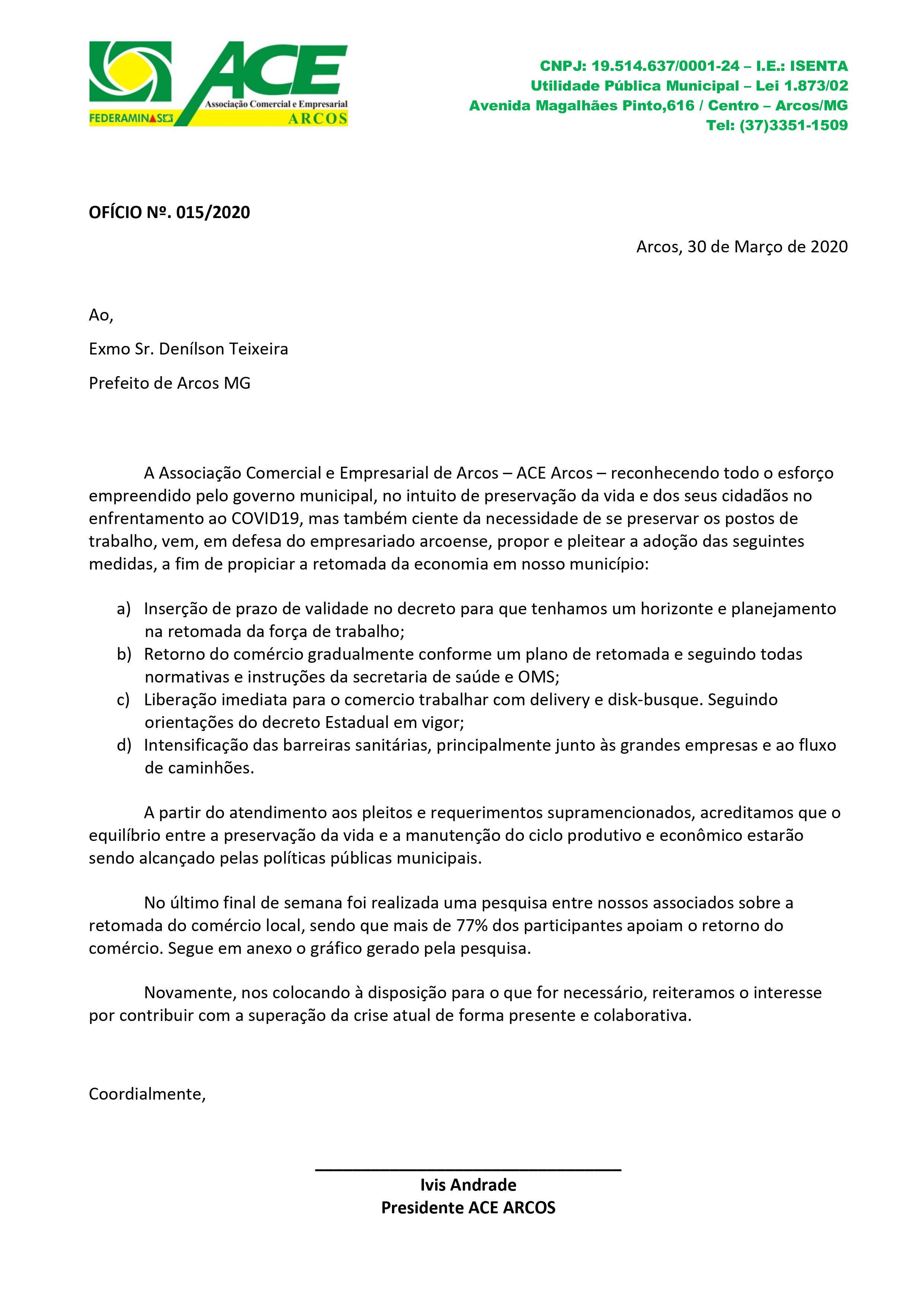 A ACE CDL Arcos representando seus associados no comitê de enfrentamento ao COVID19 e embasado na pesquisa realizada entre seus associados, protocolou os seguintes pedidos (conforme ofício em anexo):