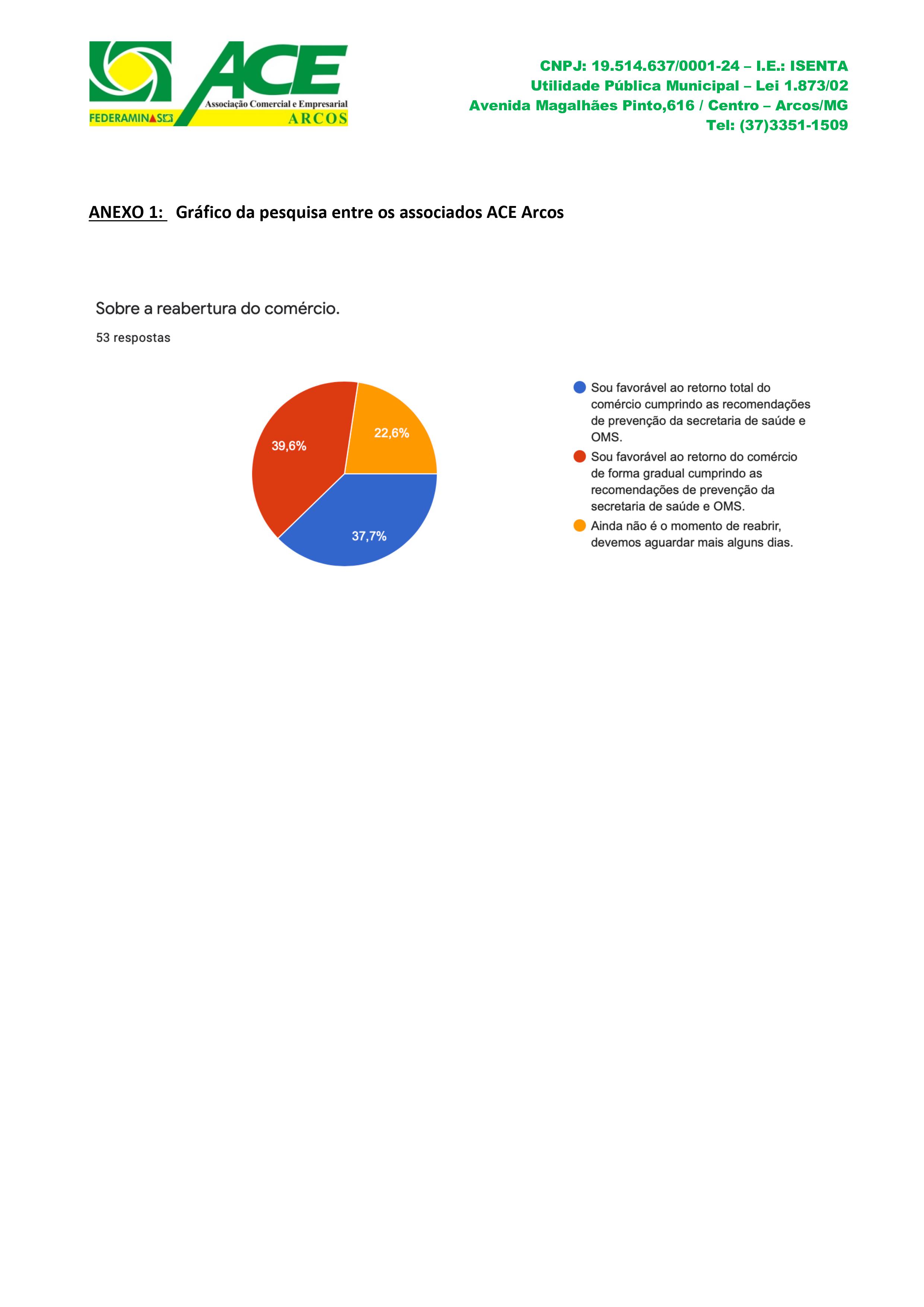 Quanto a pesquisa realizada entre os associados no último final de semana, sobre a retomada do comércio local, o resultado foi que mais de 77% dos participantes apoiam o retorno do comércio seguindo todas normativas e instruções da secretaria de saúde e OMS. Sendo 39,6% pela retomada gradual, 37,7% pela retomada imediata e 22,6% votaram que ainda não é o momento de retomar. O gráfico da pesquisa também está disponível no ofício.