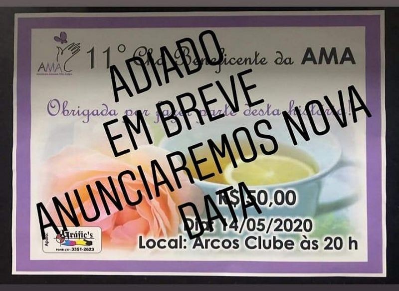 O 11º Chá Beneficente da AMA ( Associação Arcoense Mão Amiga) que seria realizado no próximo dia 14 de maio de 2020, no Arcos Clube foi adiado, devido a Pandemia da Covid-19.