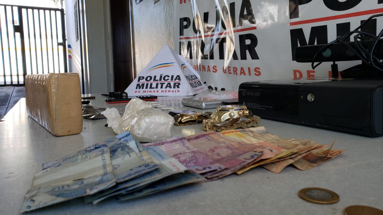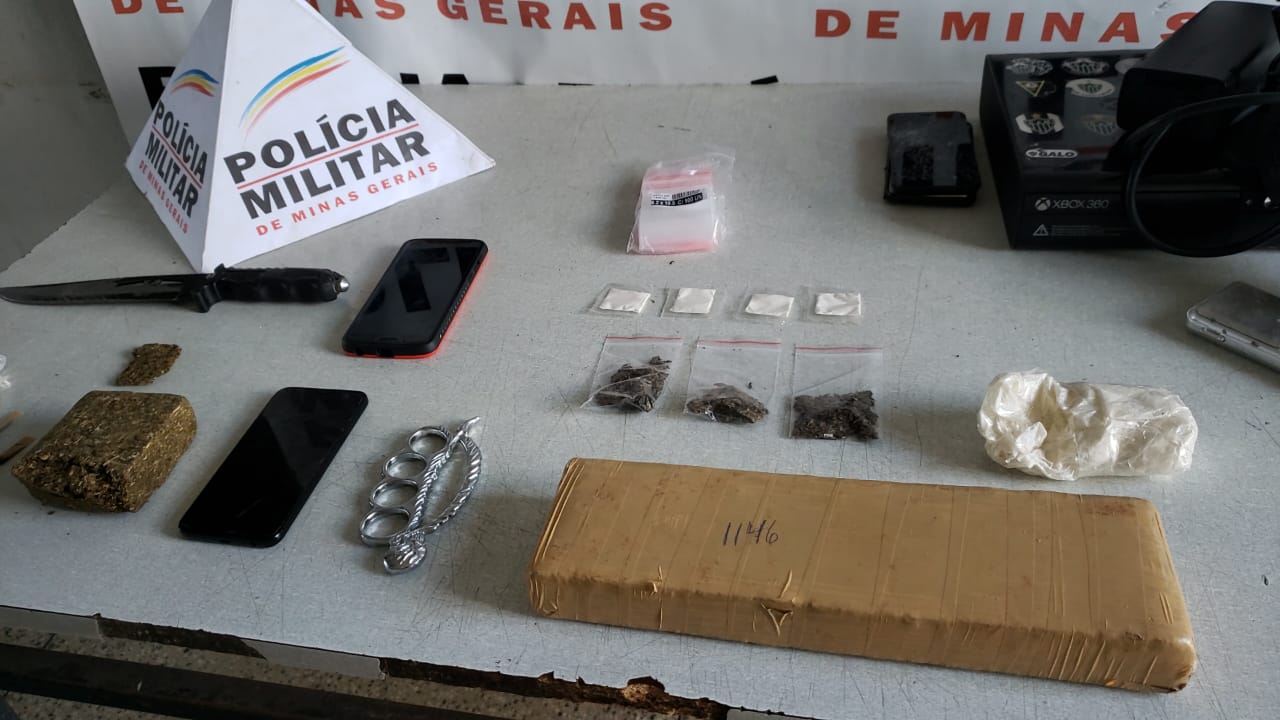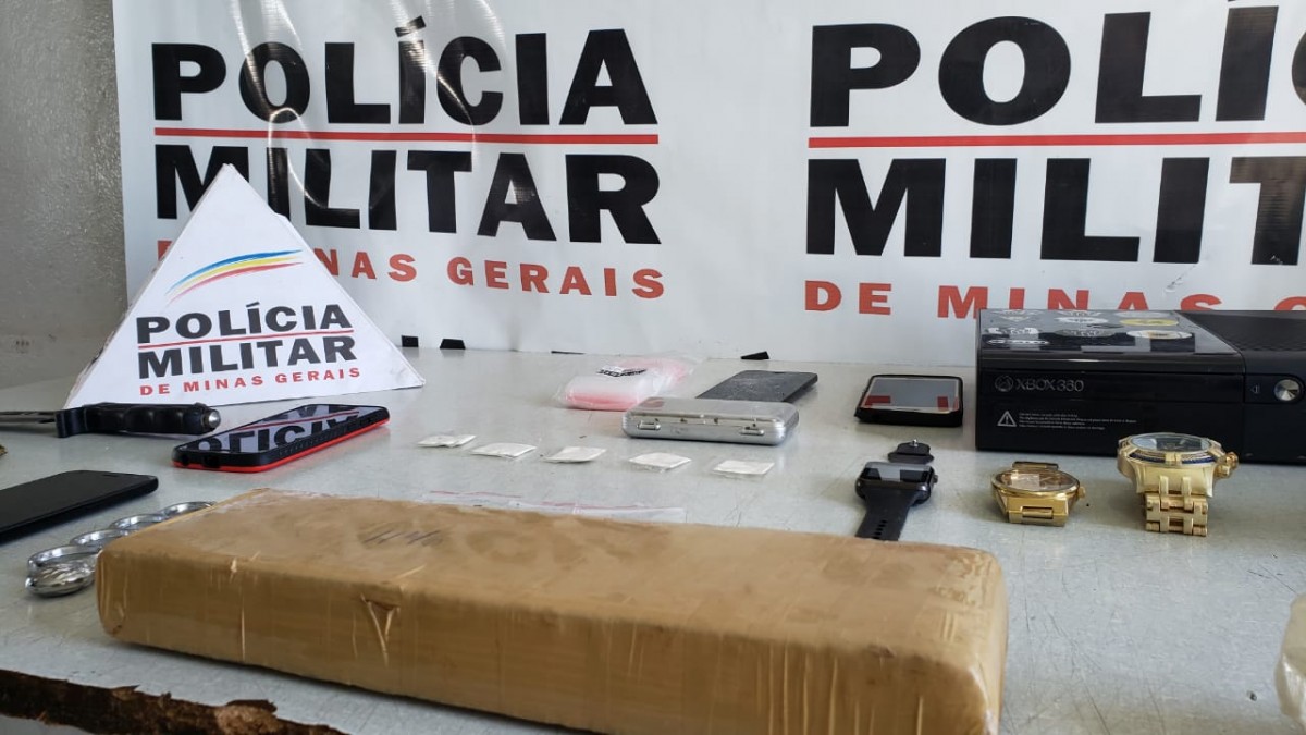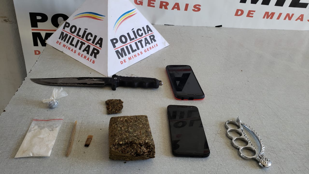Ao todo, a PM apreendeu na ocorrência: 01 faca, 01 soco inglês, 01 balança de precisão, 05 porções e 05 papelotes de cocaína, 02 cigarros, 01 bucha, 02 tabletes e 01 grande barra de maconha, além de aparelhos celulares, R$ 304,00 em dinheiro, relógios e materiais usados para embalar drogas.