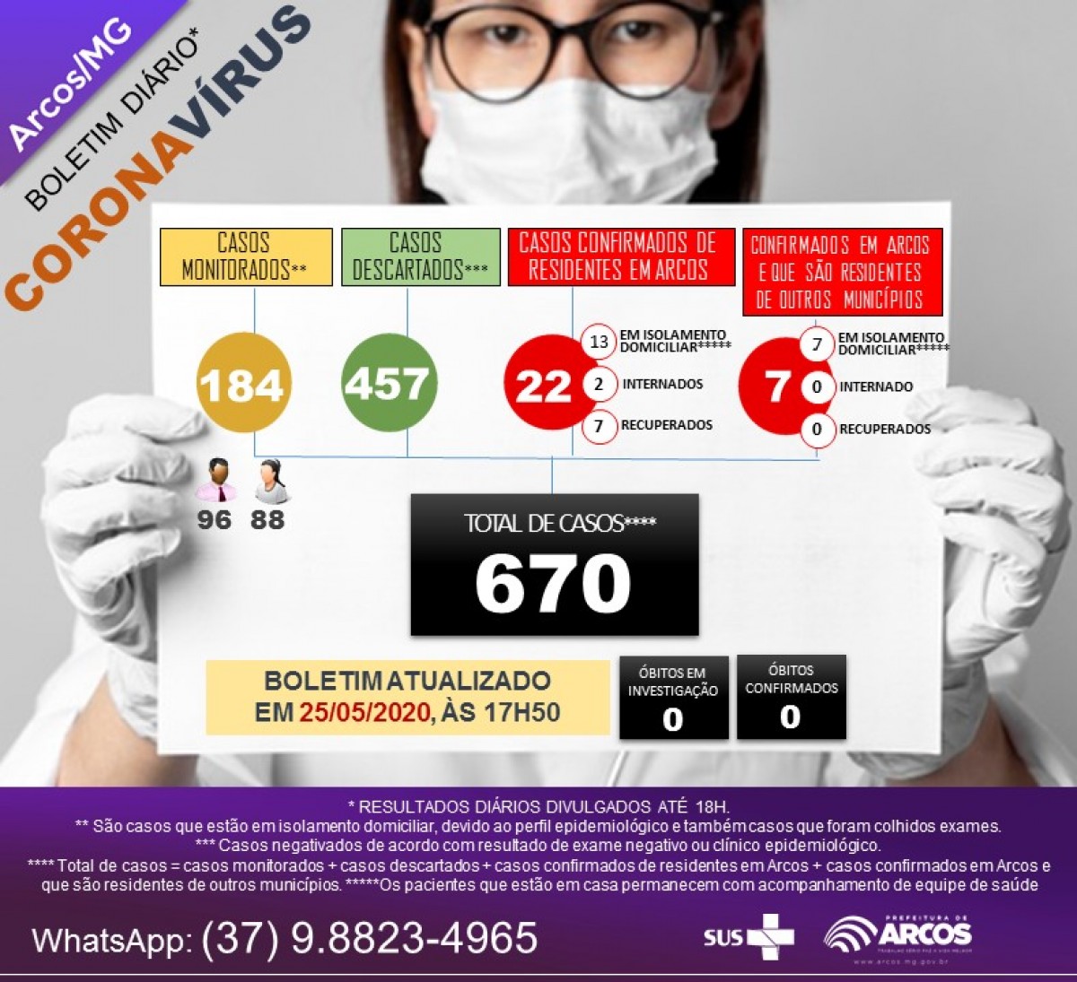 Na noite desta Segunda-Feira (25), a Secretaria Municipal de Saúde divulgou mais um Boletim Coronavírus, atualizando os dados da doença na cidade de Arcos.