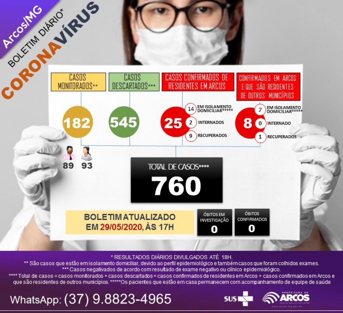 Na tarde desta Sexta-Feira (29), a Secretaria Municipal de Saúde divulgou mais um Boletim Coronavírus, atualizando os dados da doença na cidade de Arcos.