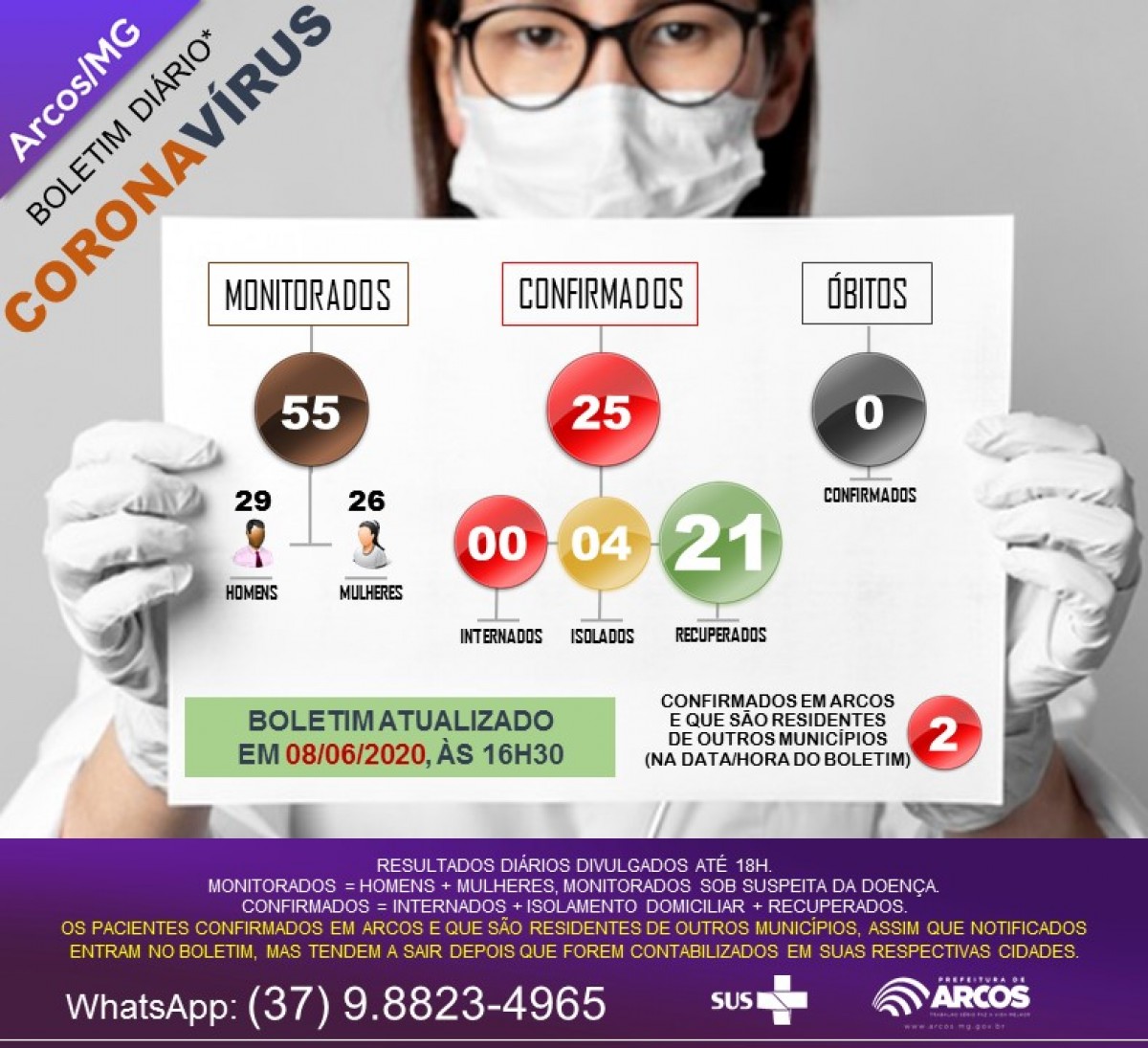 Na tarde desta Segunda-feira (08), a Secretaria Municipal de Saúde divulgou mais um Boletim Coronavírus, atualizando os dados da doença na cidade de Arcos.