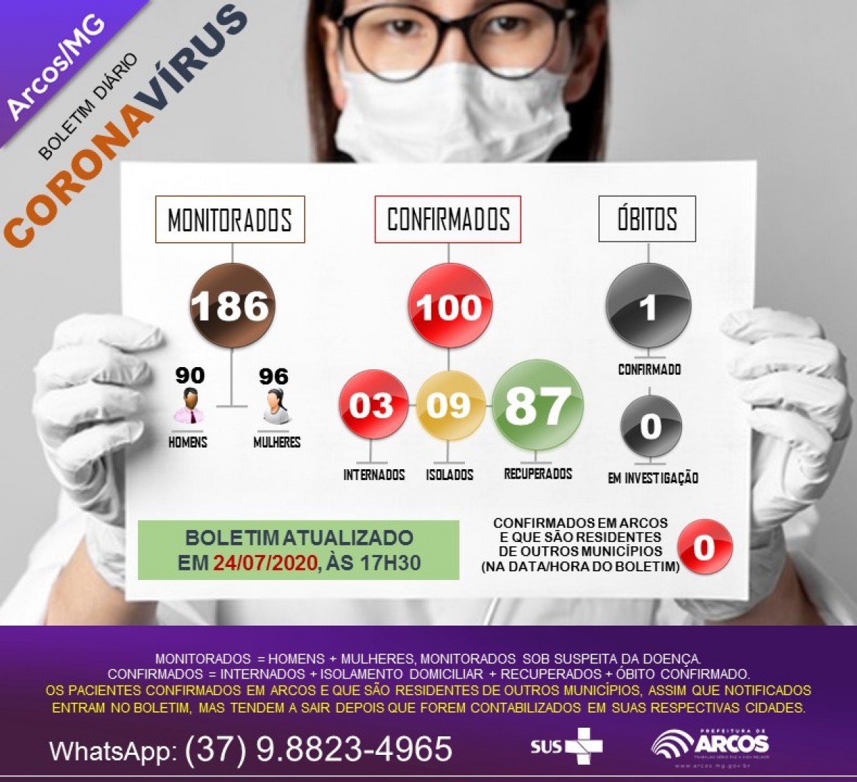 ►Casos confirmados de pessoas residentes em Arcos: 100 Casos, sendo 09 em isolamento domiciliar, 03 internados, 87 pessoas recuperadas e 01 óbito confirmado.