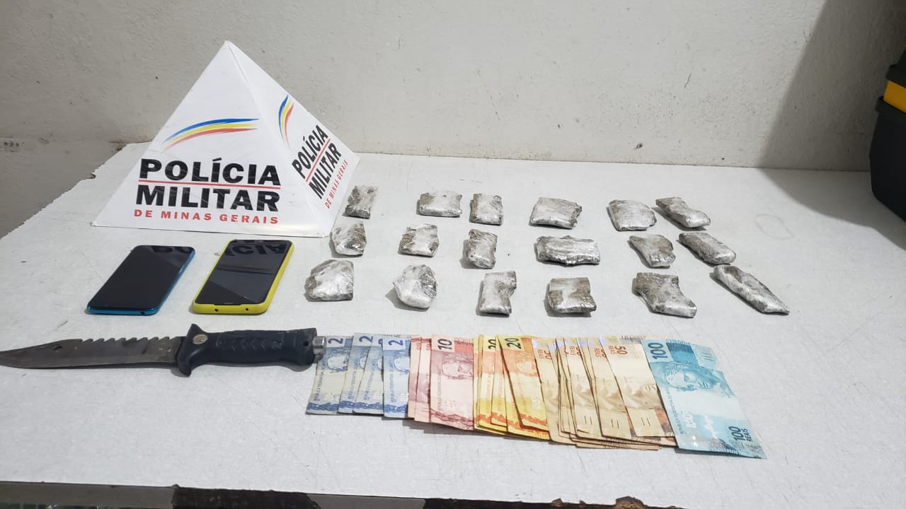 Um homem de 18 anos foi preso na noite desta segunda-feira (27) por tráfico de drogas e uma adolescente, de 17, apreendida pelo envolvimento na ocorrência. Ao todo foram localizados e apreendidos: 18 tabletes de maconha, já embalados e prontos para o comércio; R$ 1.258,00 em dinheiro, uma faca e dois aparelhos celulares.