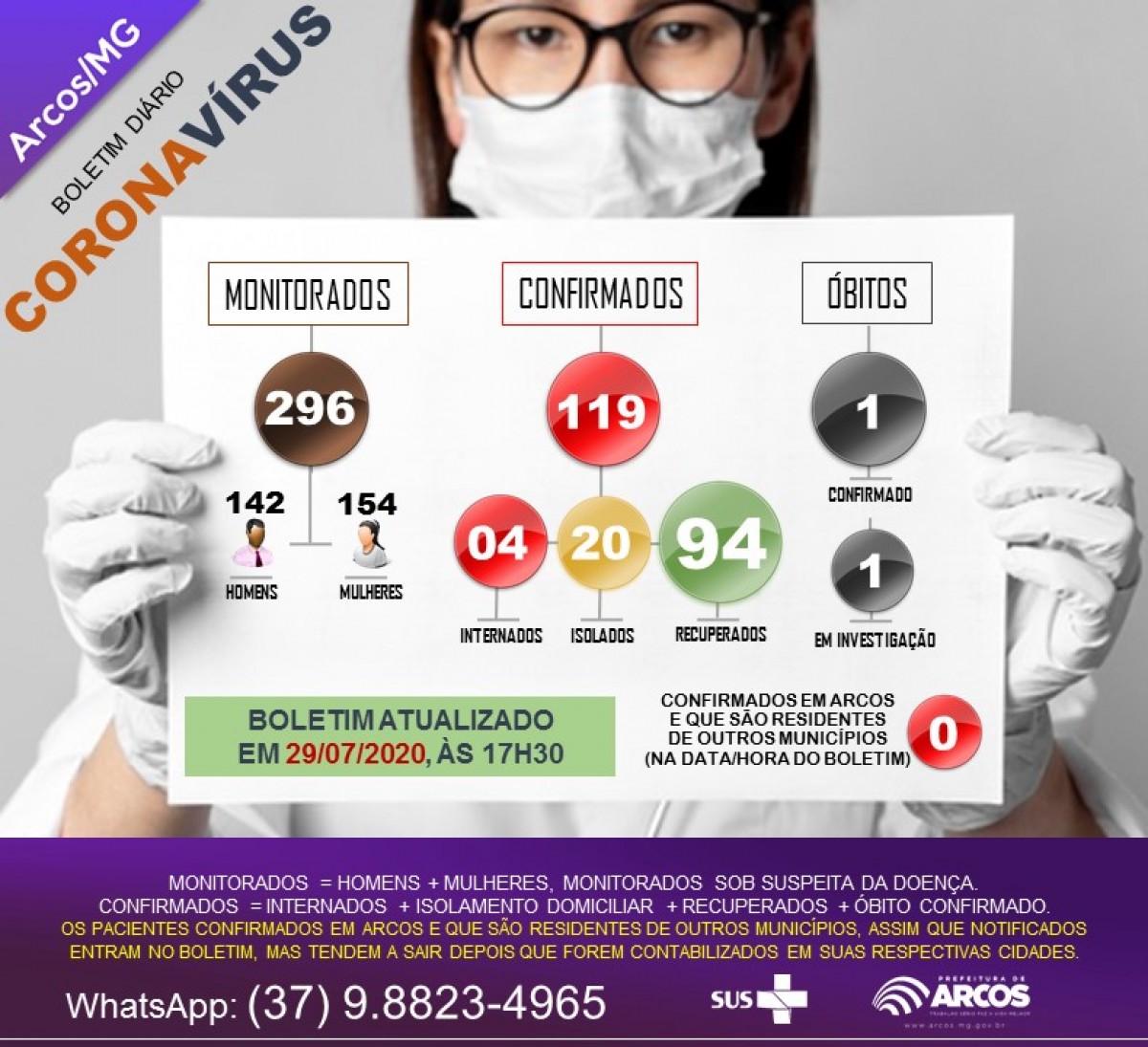 ►Casos confirmados de pessoas residentes em Arcos: 119 Casos, sendo 20 em isolamento domiciliar, 04 internados, 94 pessoas recuperadas, 01 óbito confirmado e 01 óbito em investigação.