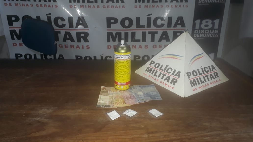 Com um deles, de 19 anos, foram encontrados 03 papelotes de cocaína e R$ 90,00 em dinheiro, de procedência duvidosa; com o outro, de 17, foram encontrados uma lata de antirespingo e R$ 70,00, sendo informado por ele que o dinheiro era resultado da venda de drogas.