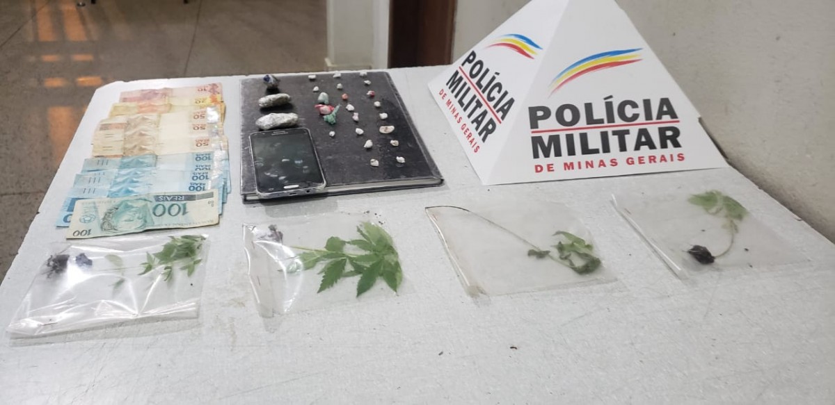 Ao todo foram apreendidos: 22 pedras de crack, 3 buchas de maconha, 4 pés da mesma substância, R$ 700,00 reais e 1 aparelho celular.