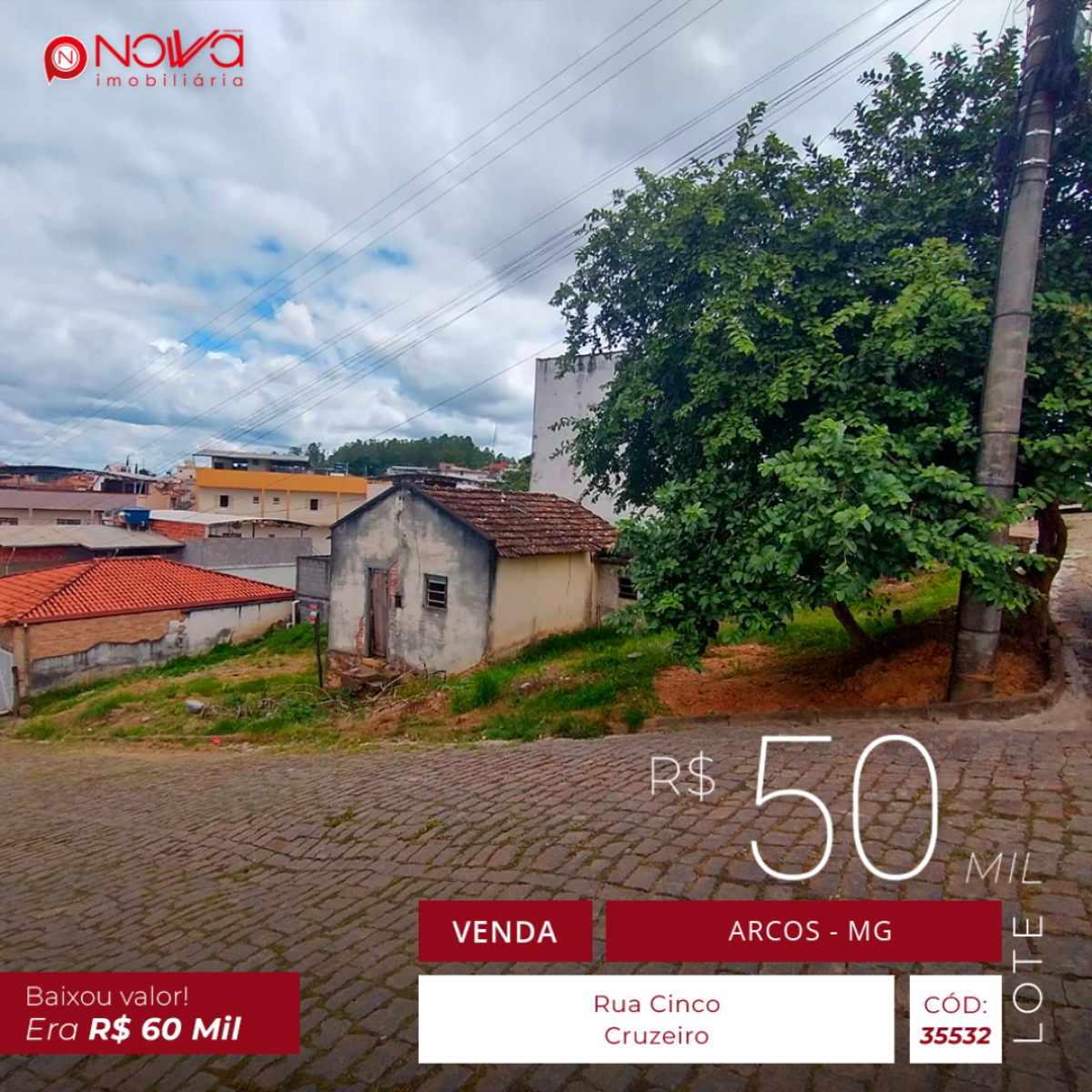 Lote de esquina à venda em Arcos, lote entre a Rua Cinco e Rua Paulo Jacinto no Bairro Cruzeiro, lote com ótima localização! Com metragem de 10×25, com total de 250 m².