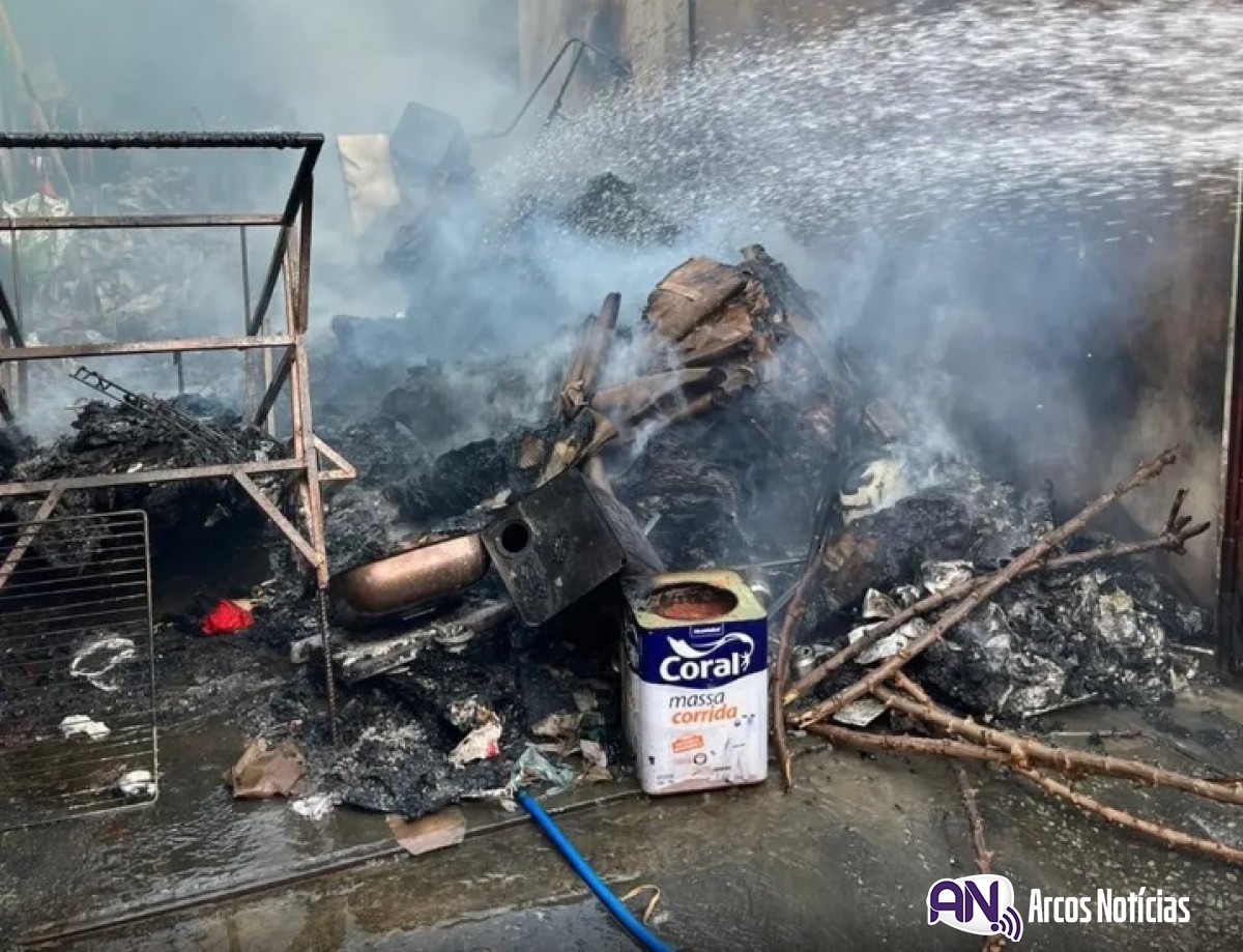 Os bombeiros encontraram uma grande quantidade de material reciclável no quintal da casa, assim como dentro do imóvel, principalmente caixas de papelão; o material pegou fogo.