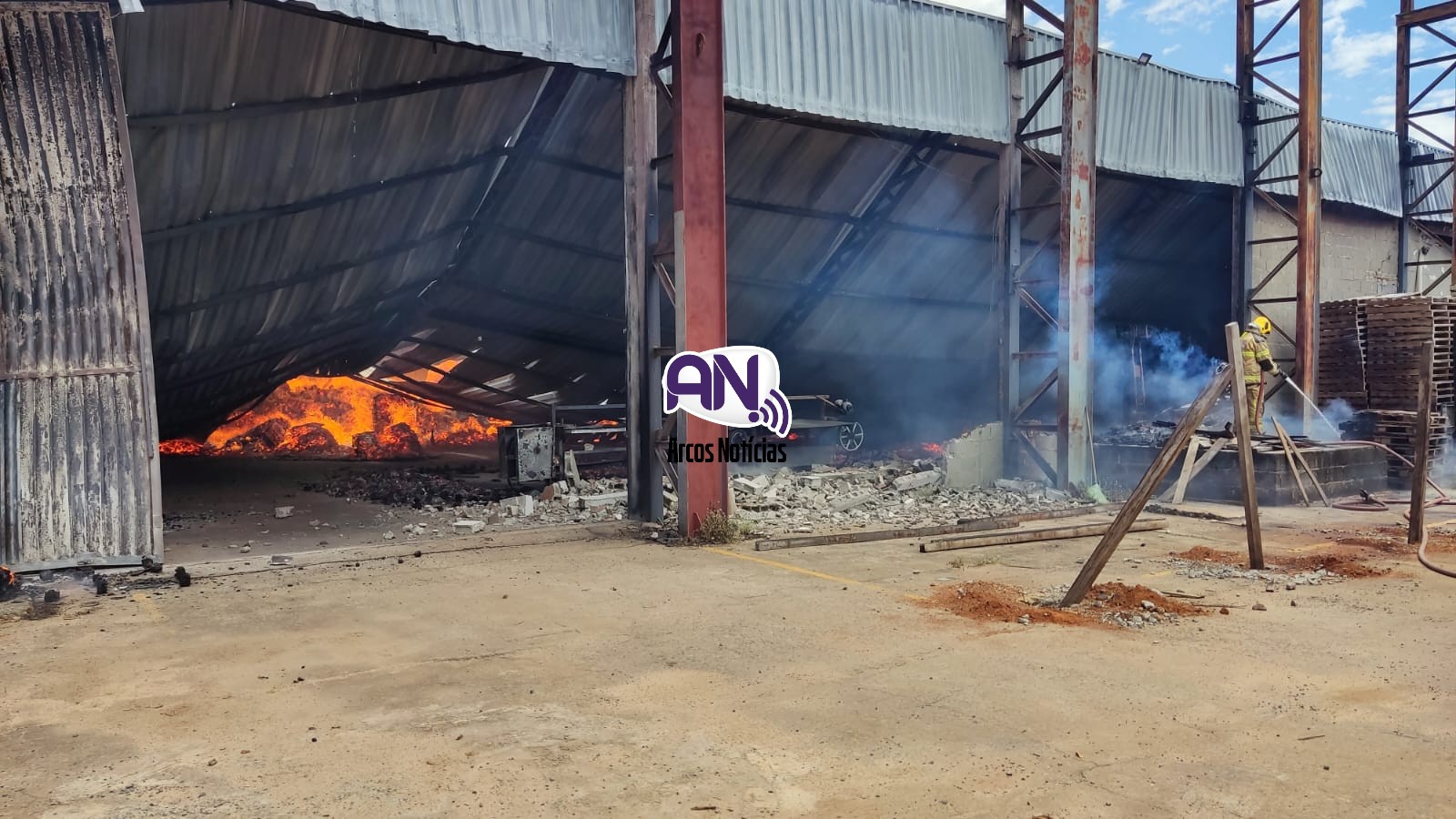 Devido a intensidade das chamas houve o colapso da estrutura do galpão que ficou praticamente todo destruído.