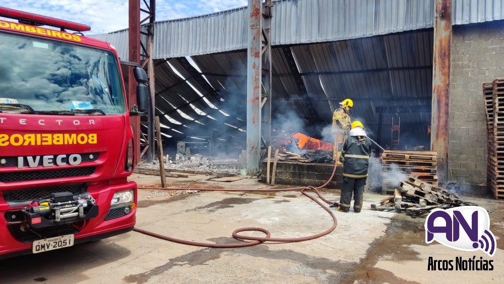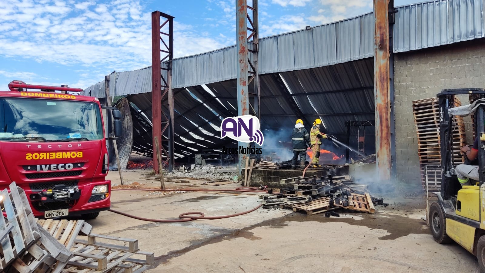 Um galpão utilizado para a produção de paletes de madeira pegou fogo na manhã desta segunda-feira (06), no Bairro Cidade industrial, em Lagoa da Prata.