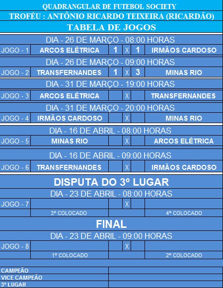 Às 19 horas: Arcos Elétrica x Transfernandes e às 20 horas: Irmãos Cardoso x Minas Rio.