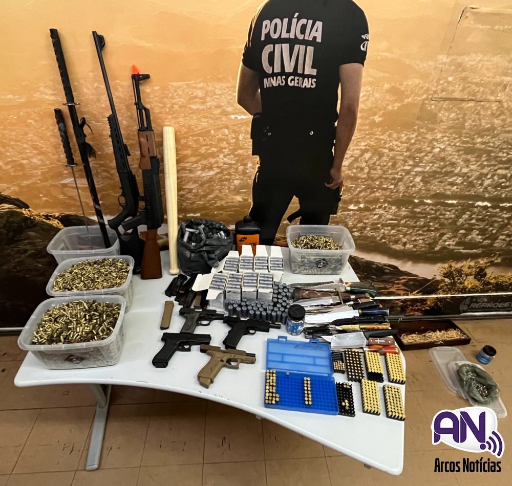 A ação resultou na apreensão de quatro armas de fogo, dois simulacros, centenas de estojos vazios, projéteis, pólvora, munições dos calibres 9mm, 12 e 22, além de um bastão de madeira, espadas, facas, adagas e outras armas brancas diversas.