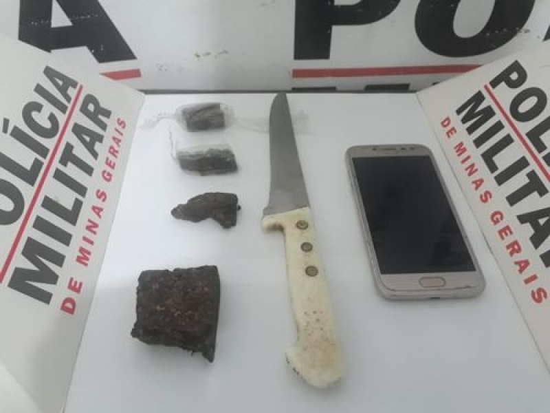 Em Arcos. na madrugada de domingo (30), às 04h25, com o acompanhamento do sistema ‘OLHO VIVO’ a um homem em atitude suspeita na BR-354, altura do bairro Calcita, que provavelmente estaria traficando drogas. Os Policias Militares efetuaram a abordagem dele, encontrando, no ato, 04 porções de maconha. No desenrolar da ocorrência também foram localizados e apreendidos: 01 tablete da mesma substância, 01 faca com resquícios de drogas e o aparelho celular do autor, que tem 19 anos de idade. Ele foi conduzido à Delegacia de Formiga, para onde também seguiram os materiais.