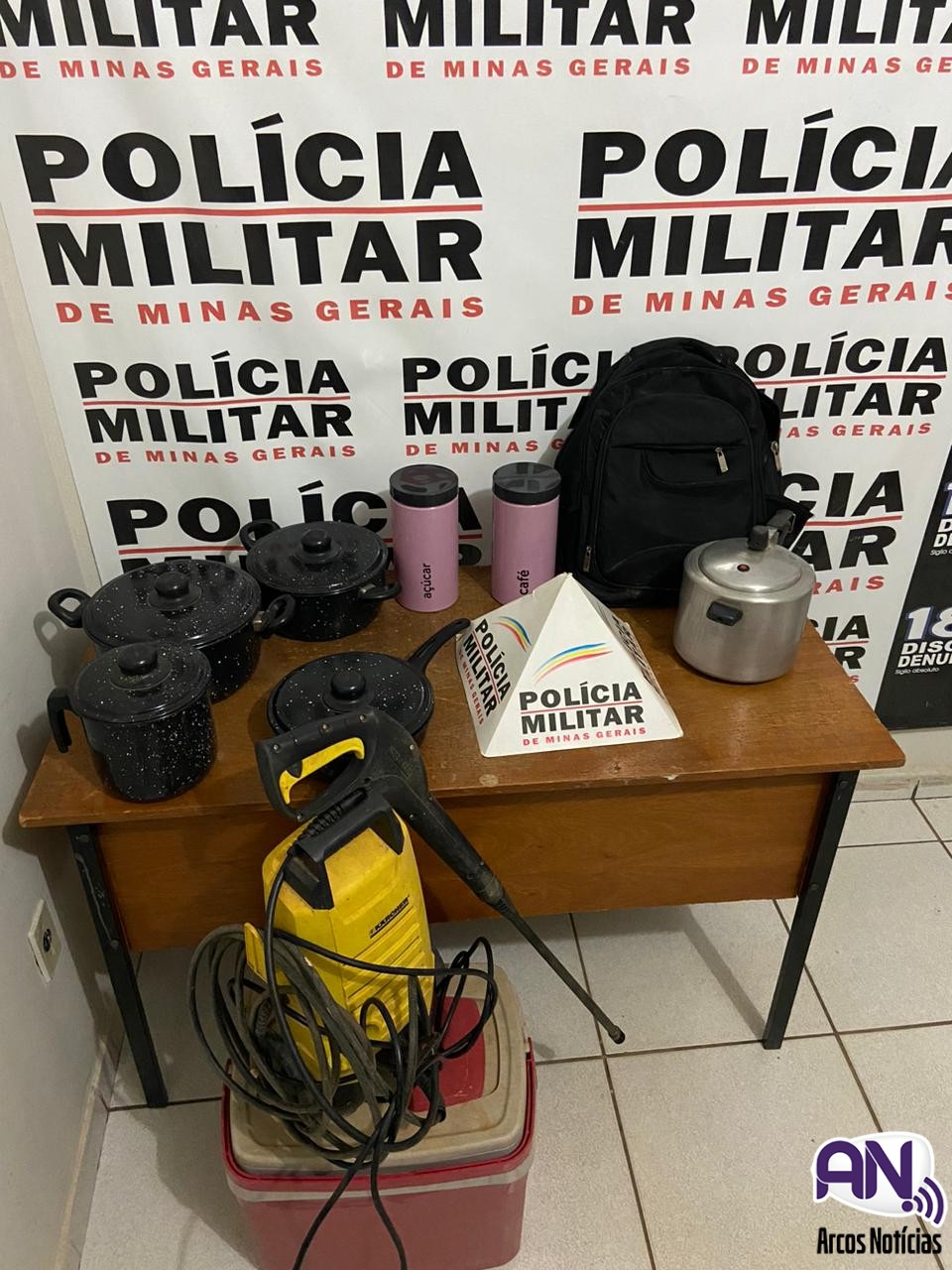E na madrugada desta segunda (04), dois homens foram presos por furto a residência na cidade de Bambuí. Eles haviam invadido a casa de uma mulher no bairro Açudes e levado várias panelas, mochila e equipamento para lavagem de carros.
