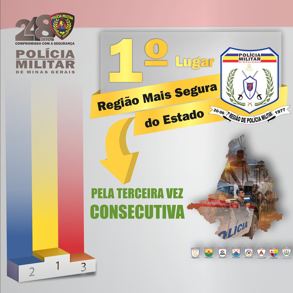 Neste relatório, a 7ª RPM obteve a maior redução de crimes violentos do Estado, o que significa que é a Região menos violenta de Minas Gerais no ano de 2023. Também foi a terceira Região de Polícia Militar que mais apreendeu armas.