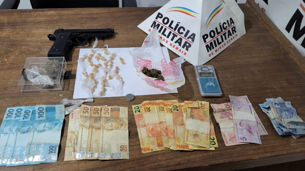 No total foram apreendidos: duas buchas de maconha, 45 pedras de crack, um papelote de cocaína, R$ 860,00 em dinheiro, uma balança de precisão, uma réplica de arma de fogo e materiais usados para embalar drogas.