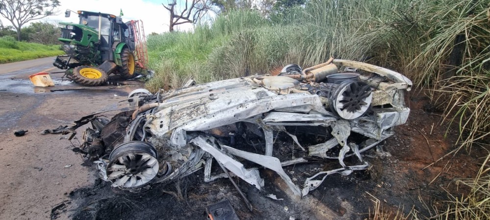 Em certo momento, o trator invadiu a contramão e ambos os veículos bateram, sendo que o carro capotou e pegou fogo em seguida.