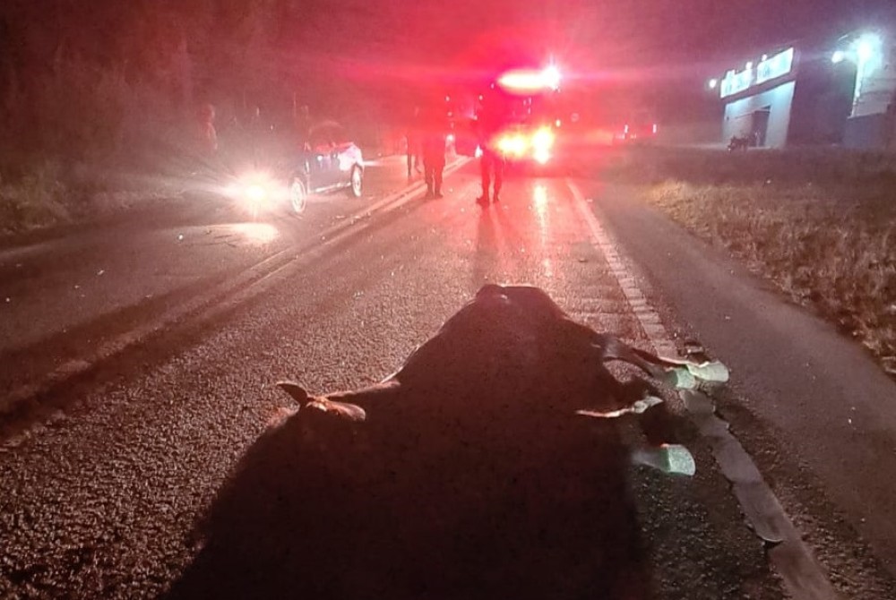 Em seguida, um motociclista de cerca de 39 anos, que trafegava no sentido oposto, colidiu contra o animal, sofrendo uma queda grave.