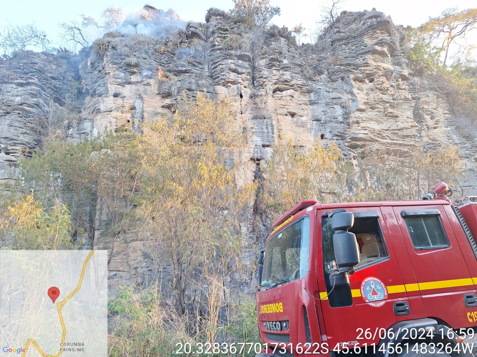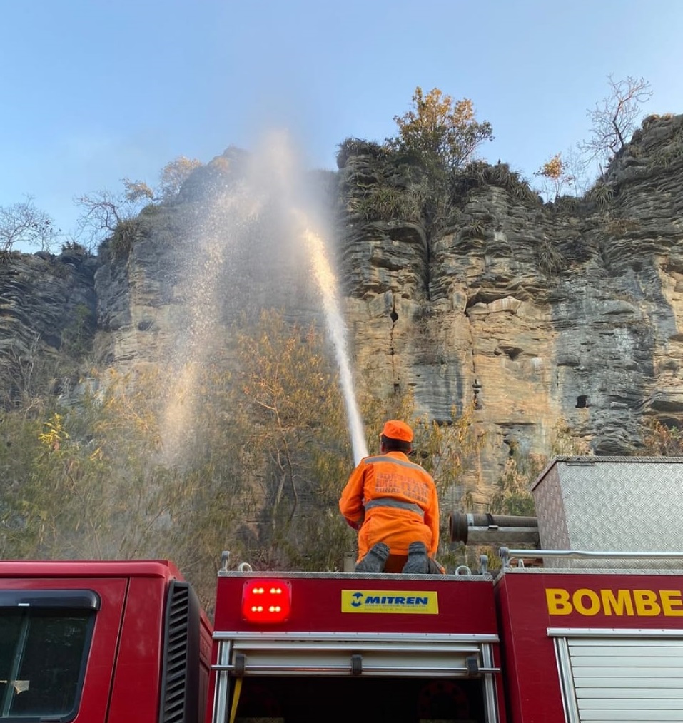 O Corpo de Bombeiros Militar de Arcos foi acionado e, ao chegar ao local, encontrou dois brigadistas profissionais da empresa CSN já combatendo as chamas na base de uma grande montanha de rochas.