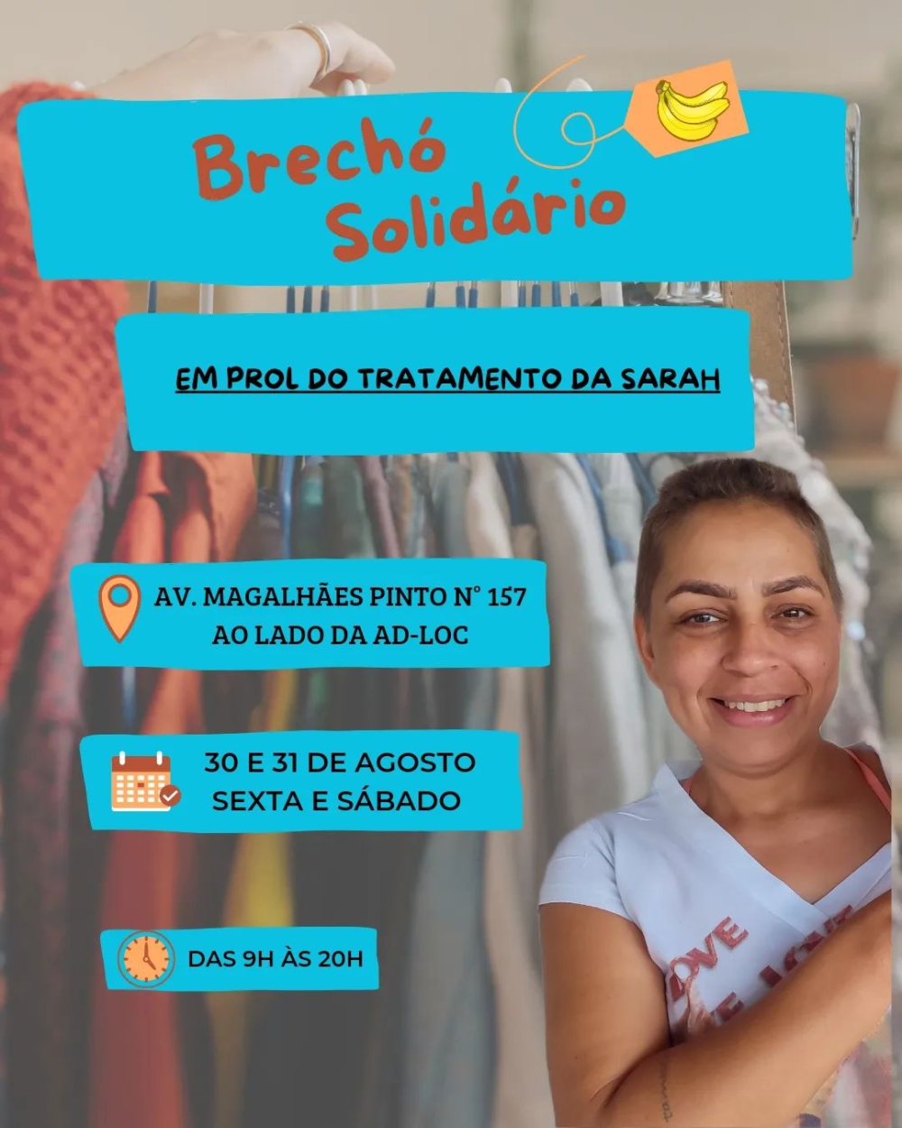 Venha participar do nosso Brechó Solidário nos dias 30 e 31 de agosto, sexta e sábado, das 9h às 20h! Estamos localizados na Av. Magalhães Pinto, nº 157, ao lado da AD-LOC.