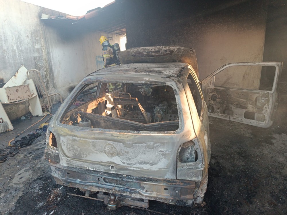 Um carro ficou destruído após pegar fogo em garagem de casa na Rua Goiabeiras, no Bairro Geraldo Veloso, em Formiga, na tarde desta segunda-feira (7).
