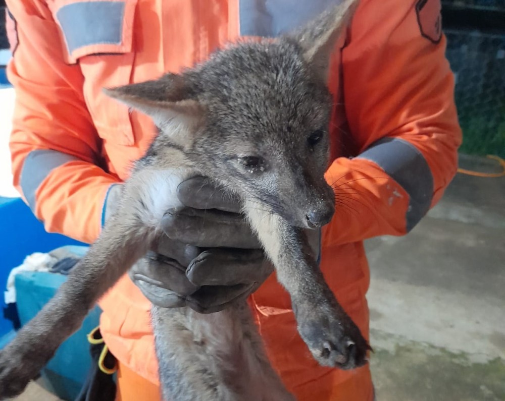 Um filhote de raposa, encontrado ferido em uma estrada de terra, foi capturado por um morador local, que acionou a equipe de bombeiros para prestar assistência.