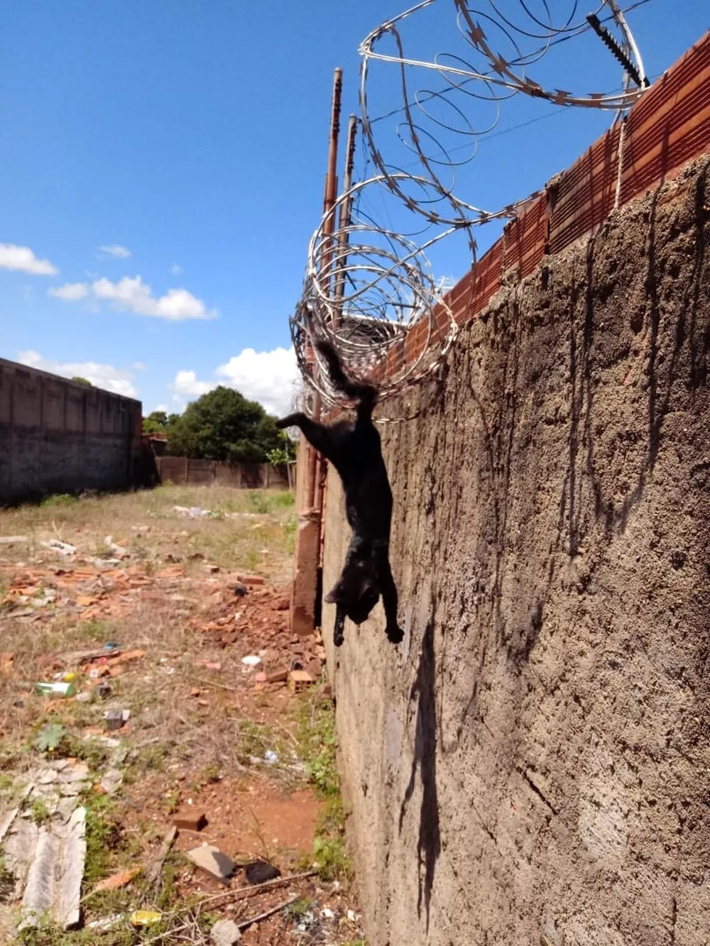 Ao chegarem ao local, os bombeiros constataram que o felino estava preso pelo rabo nos fios de arame da concertina, instalada sobre o muro da residência. A posição em que o animal se encontrava gerava grande agitação e agressividade, exigindo uma intervenção rápida e cuidadosa para evitar ferimentos mais graves.