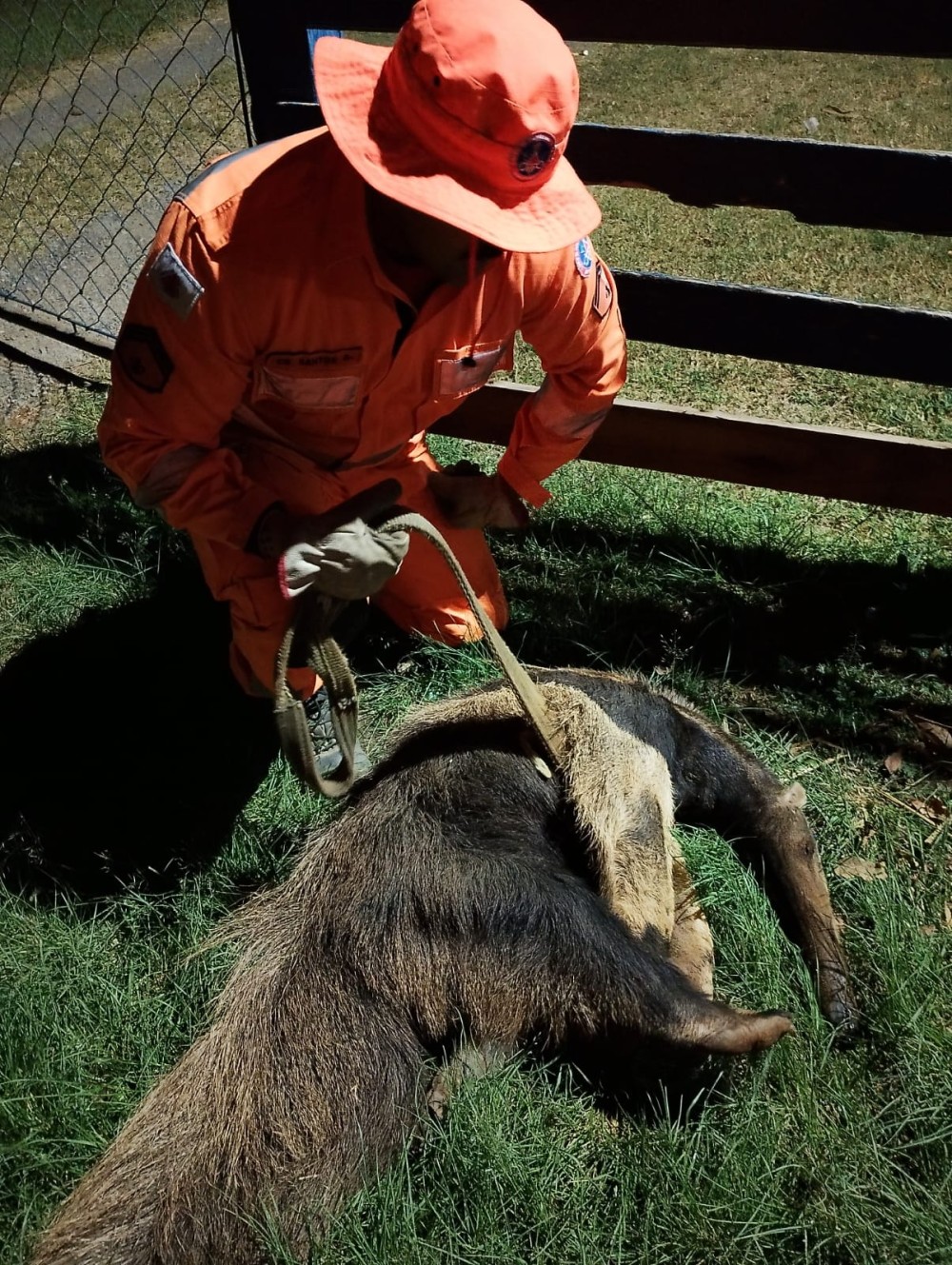 Na tarde do último sábado (30), uma equipe do Corpo de Bombeiros Militar foi acionada para realizar o resgate de um tamanduá-bandeira que se encontrava debilitado e prostrado em uma fazenda na zona rural de Arcos/MG.