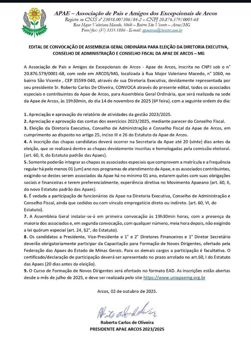 O encontro será realizado no dia 14 de novembro de 2025 (sexta-feira), às 19h30, na sede da instituição, localizada na Rua Major Valeriano Macedo, nº 1060, bairro São Vicente, em Arcos. A convocação foi assinada pelo presidente da APAE de Arcos, Roberto Carlos de Oliveira.