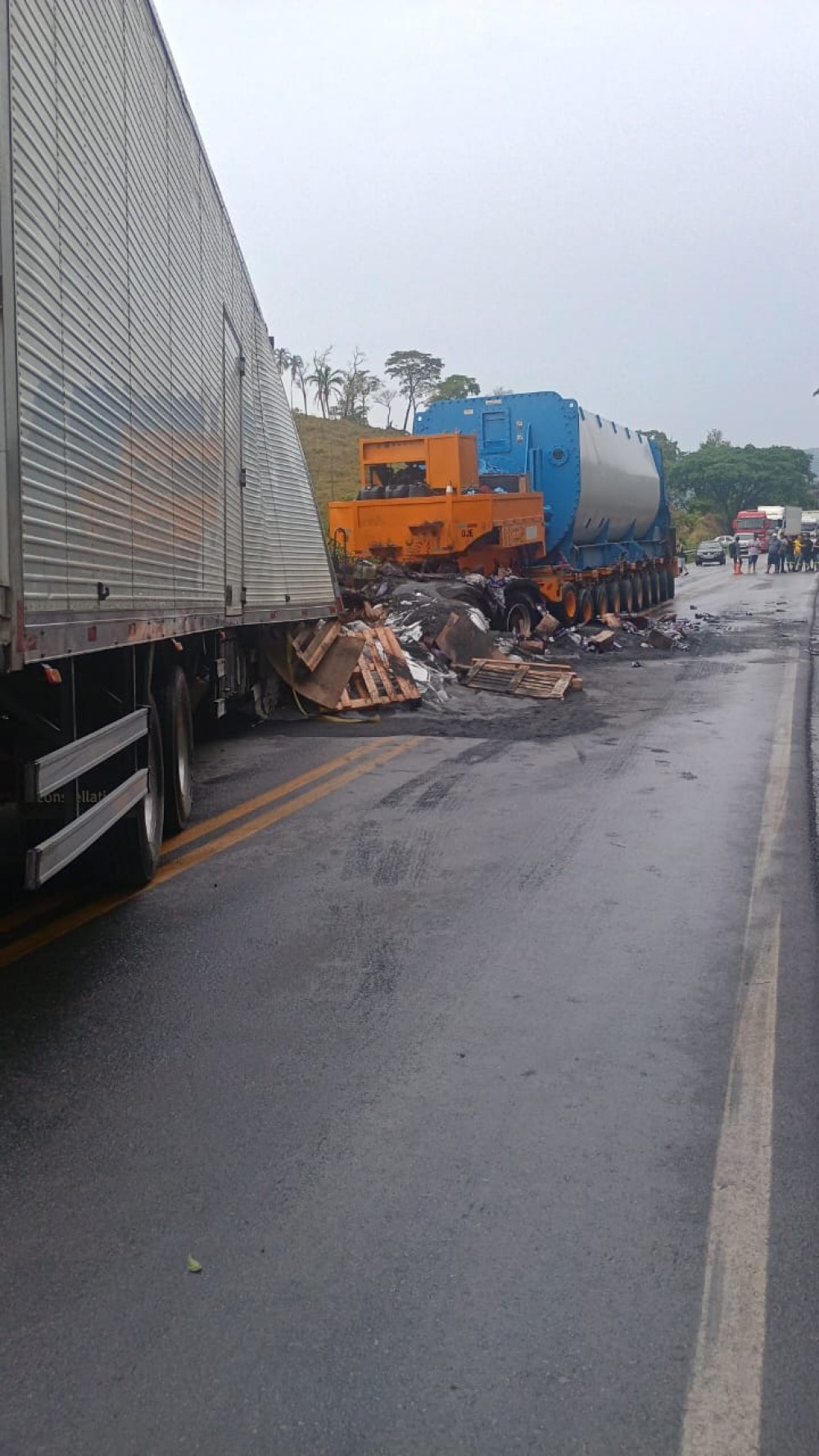 O veículo de carga envolvido transportava material superdimensionado, possuía Autorização Especial de Trânsito (AET) válida, emitida pelo DNIT, e sua remoção depende de um veículo especializado vindo de São Paulo (SP).