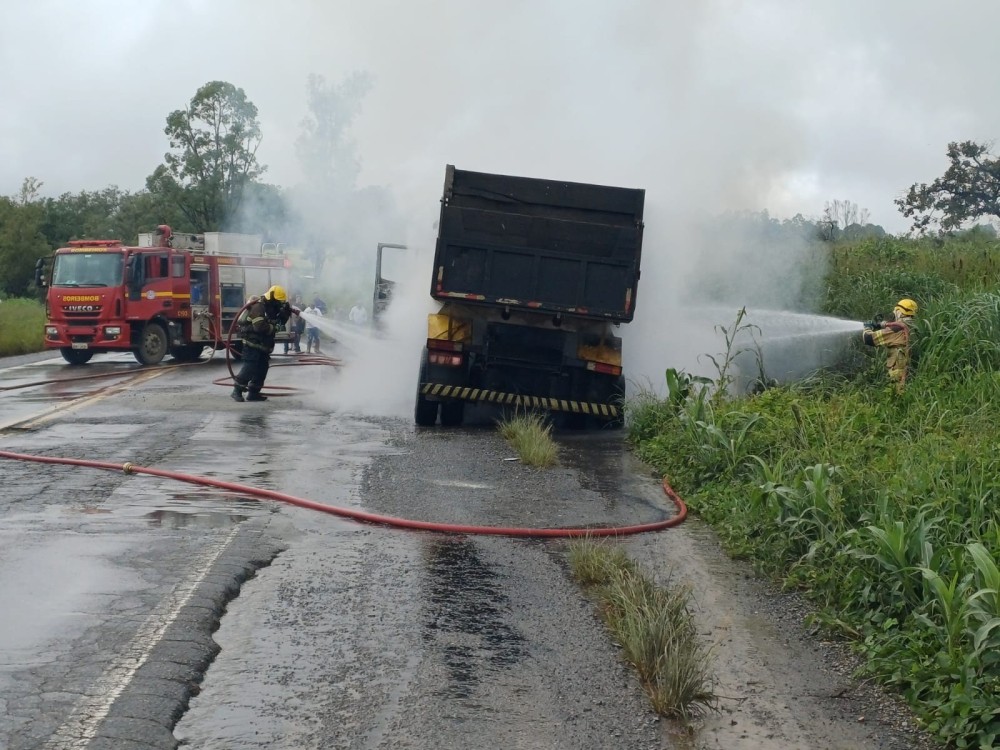 Ao chegarem ao local, os militares encontraram um caminhão M.Benz/L 1620, carregado com pedras, parado no acostamento e já tomado pelas chamas. O fogo atingia o compartimento do motor, a cabine e os pneus do veículo, gerando intensa fumaça e risco aos demais usuários da rodovia.