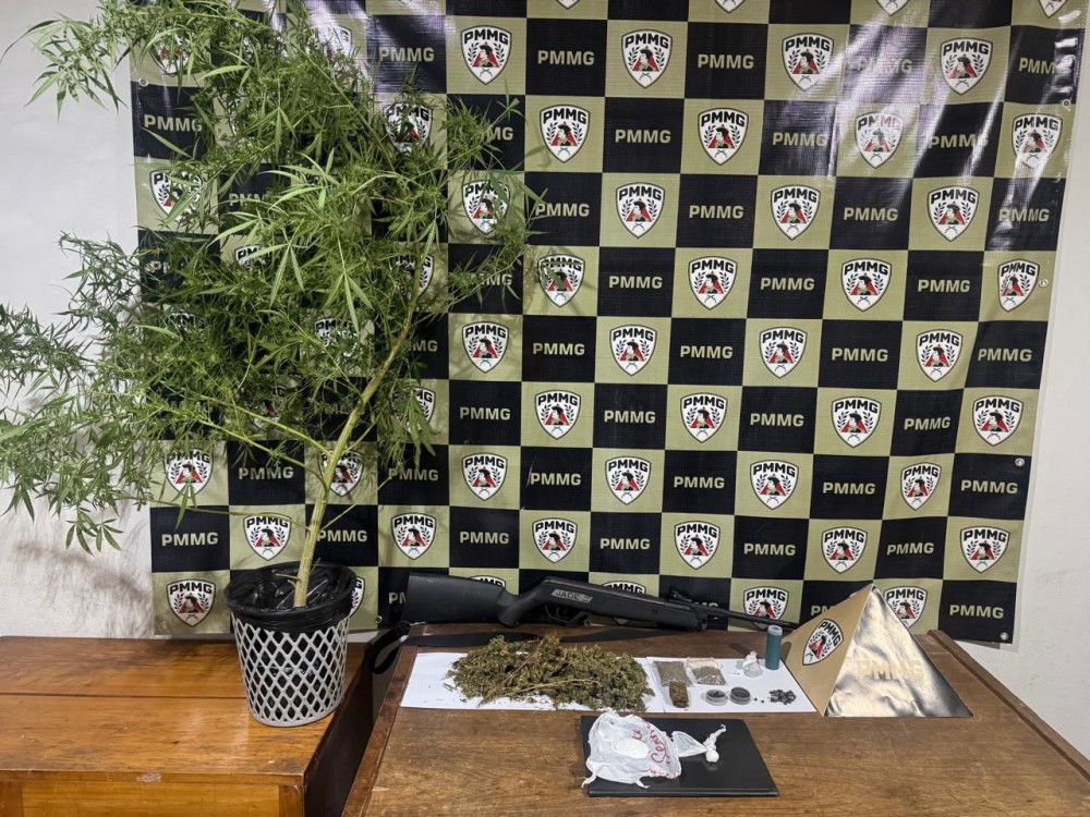Com autorização da responsável, os militares se deslocaram até a residência da família, onde localizaram um pé de maconha com aproximadamente 1,5 metro de altura. No quarto do menor, foram apreendidos um saco plástico contendo grande quantidade de folhas secas de maconha, dois pacotes com sementes da mesma substância, um invólucro com material semelhante à cocaína, um frasco com pólvora granulada, um pote com espoletas, um invólucro com chumbo e uma espingarda do tipo “poveira”. Segundo a mãe, a arma seria utilizada para caça.