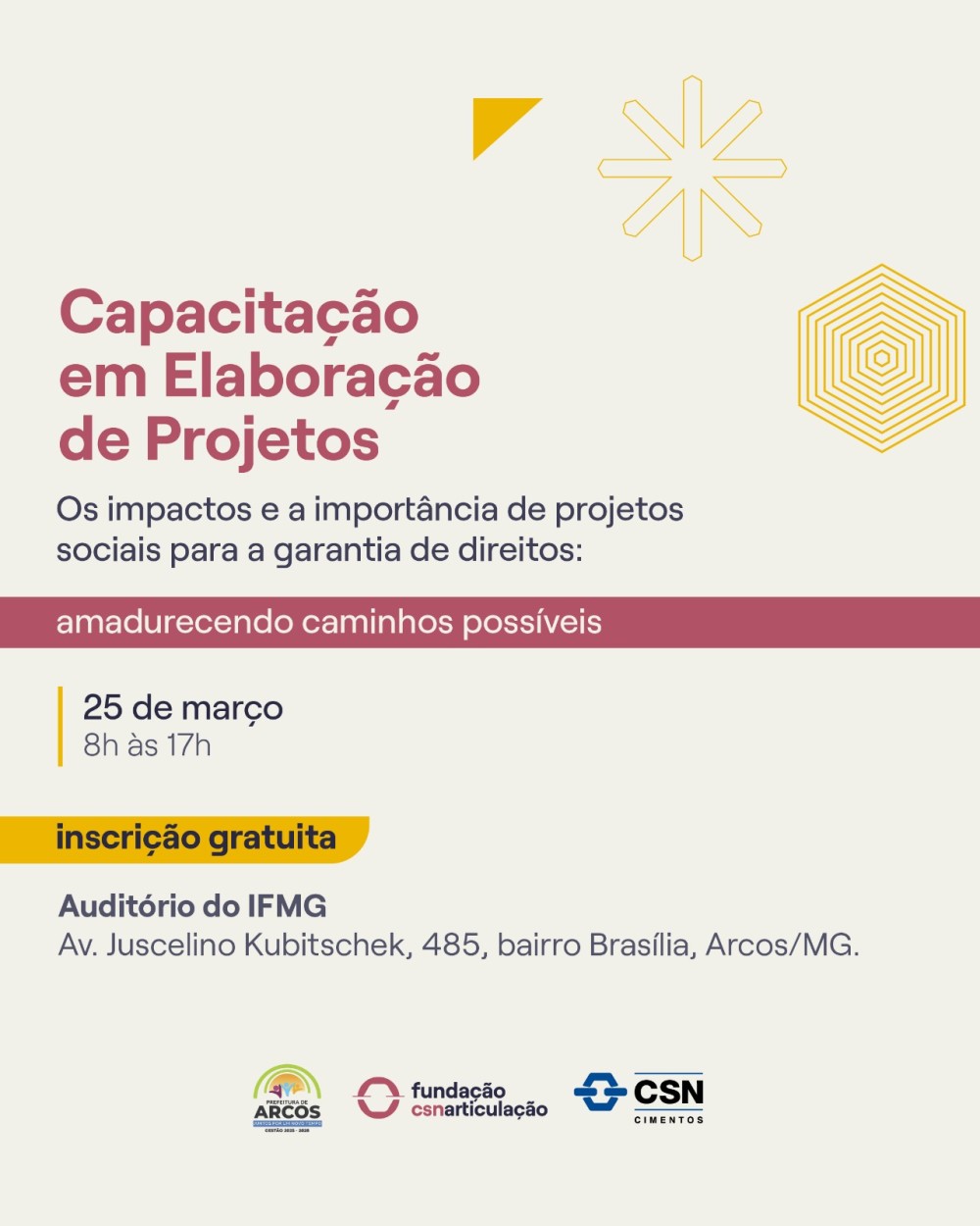 A formação acontecerá das 8h às 17h, no auditório do Instituto Federal de Minas Gerais (IFMG) – Campus Arcos, reunindo representantes de organizações que desejam aprimorar seus conhecimentos na estruturação, planejamento e apresentação de projetos.