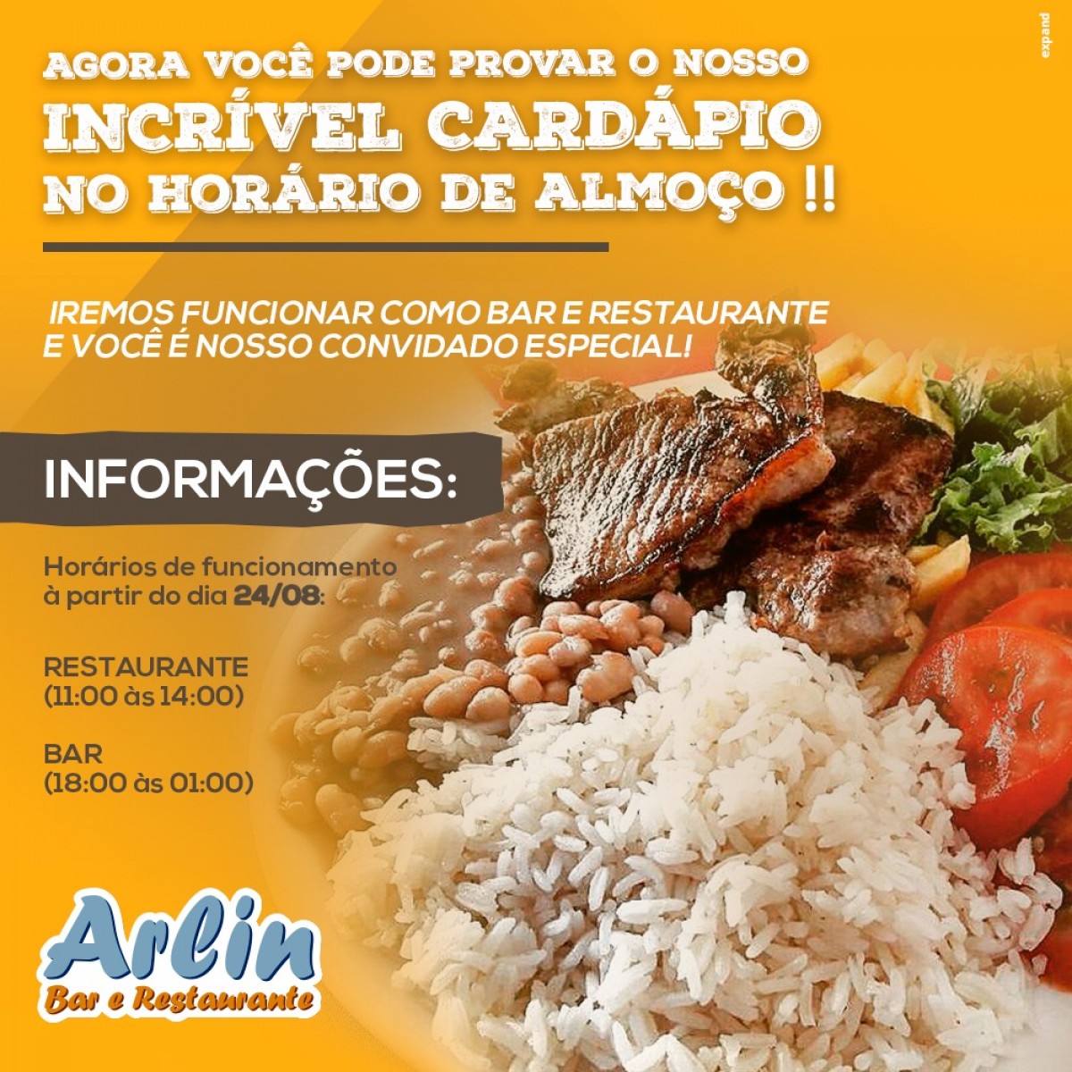 Com a tradição de sempre inovar, a partir desta segunda-feira (24), o Bar do Arlin também trabalhará como restaurante, de 11 às 14 horas, servindo deliciosas refeições, feitas com muito carinho e amor, que são os ingredientes que tornaram o Bar do Arlin, referência em nossa região.