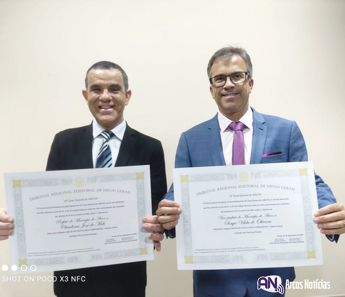 O professor Claudenir José de Melo (Baiano) e o médico Dr. Sérgio Vilela, respectivamente prefeito e vice eleitos na cidade de Arcos, foram diplomados no final da tarde desta quarta-feira (16). O juiz de Direito da 2ª Vara do município, Dr. Tiago Ferreira Barbosa, presidiu a solenidade.