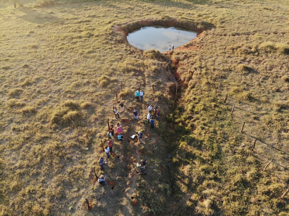 A primeira ação foi o planejamento para implantação do sistema de barraginhas em série. Foram feitas três barraginhas (bacias de captação de água superficial) uma seguida da outra e ao final, a quarta foi feita uma grande bacia para colher as águas.