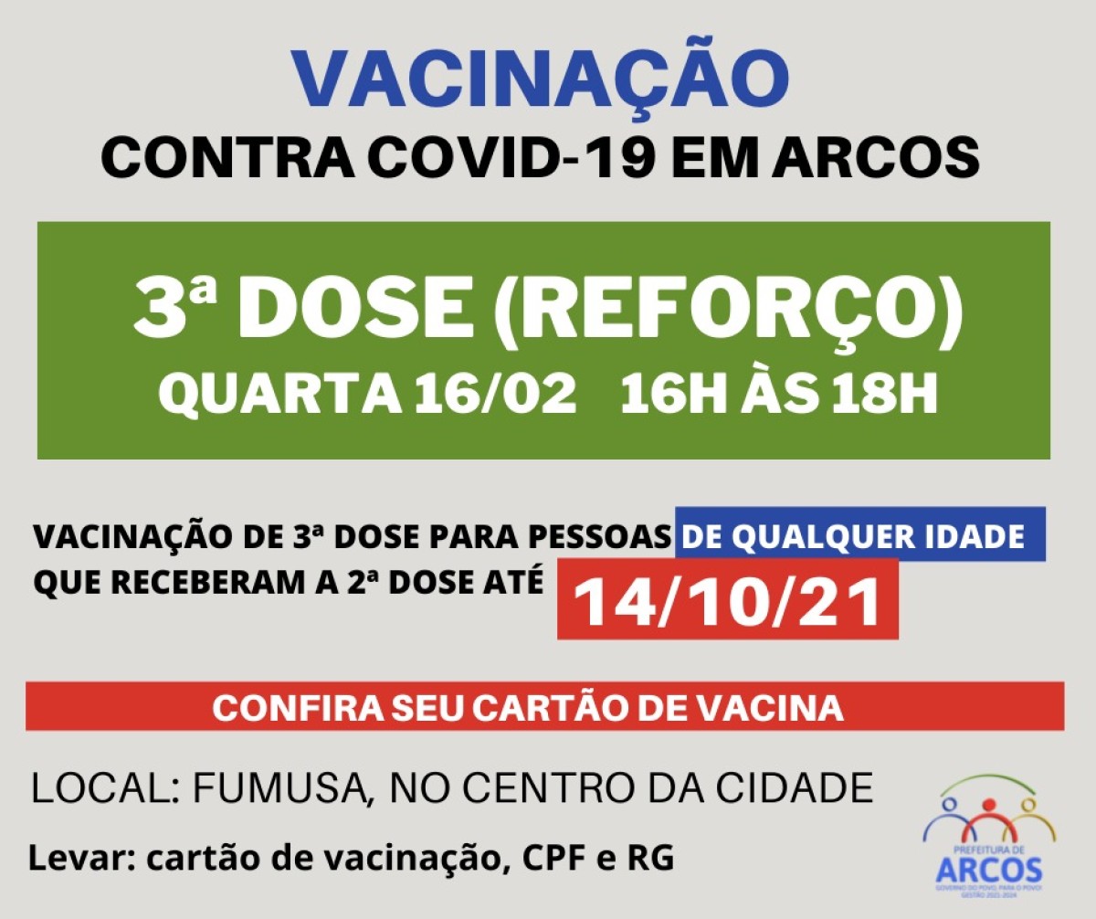 A Prefeitura de Arcos, por meio da Secretaria Municipal de Saúde, convoca as pessoas de qualquer idade, que tenham recebido a segunda dose da vacina Covid-19 até 14 de outubro de 2021, para aplicação da Terceira Dose.