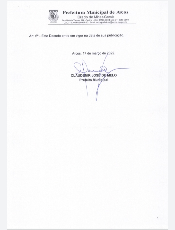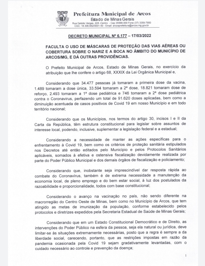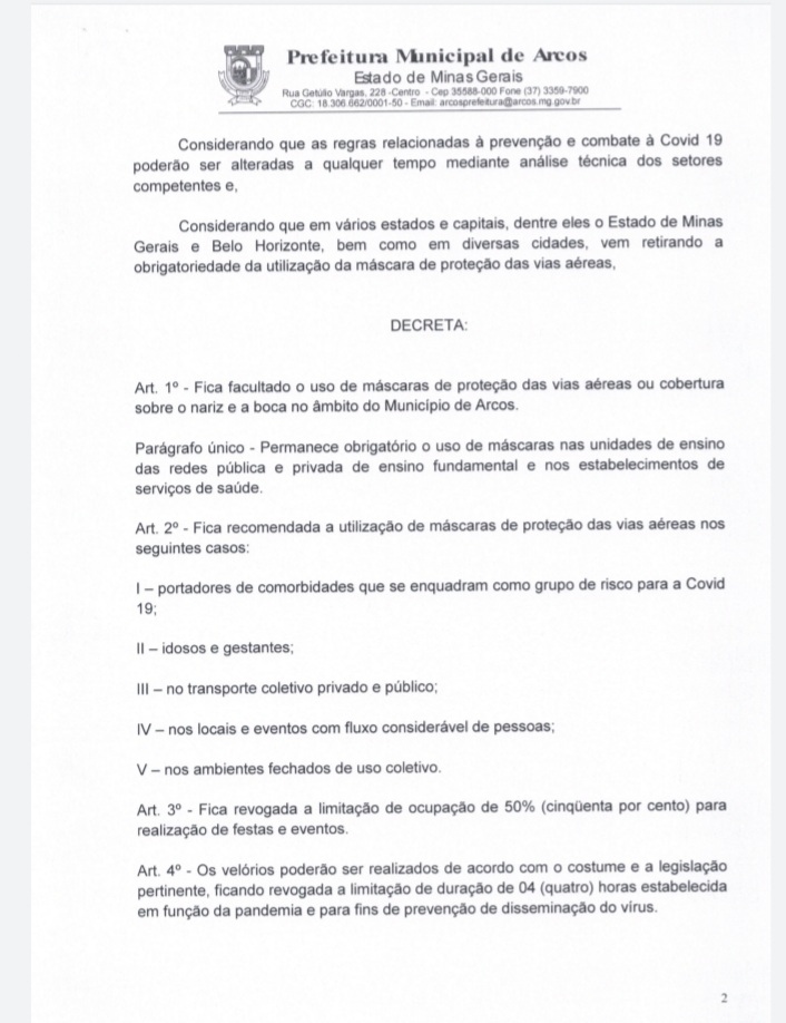 Em Arcos, um Novo decreto foi publicado na tarde de quinta-feira (17) tornando facultativo o uso de máscaras em todo o município.