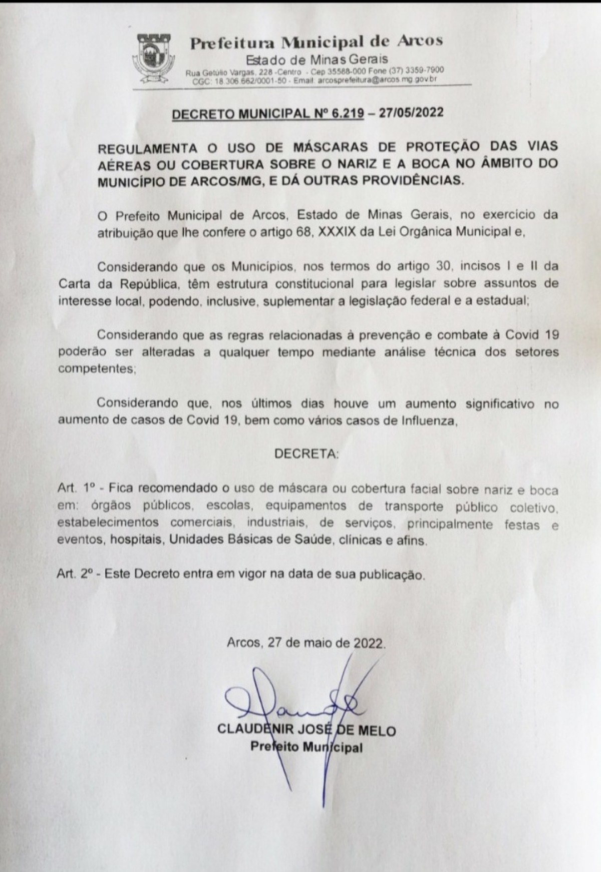 O Decreto Municipal 6.219, assinado pelo prefeito Claudenir José de Melo-Baiano, explica que a recomendação é uma forma de prevenção ao Coronavírus e à influenza.