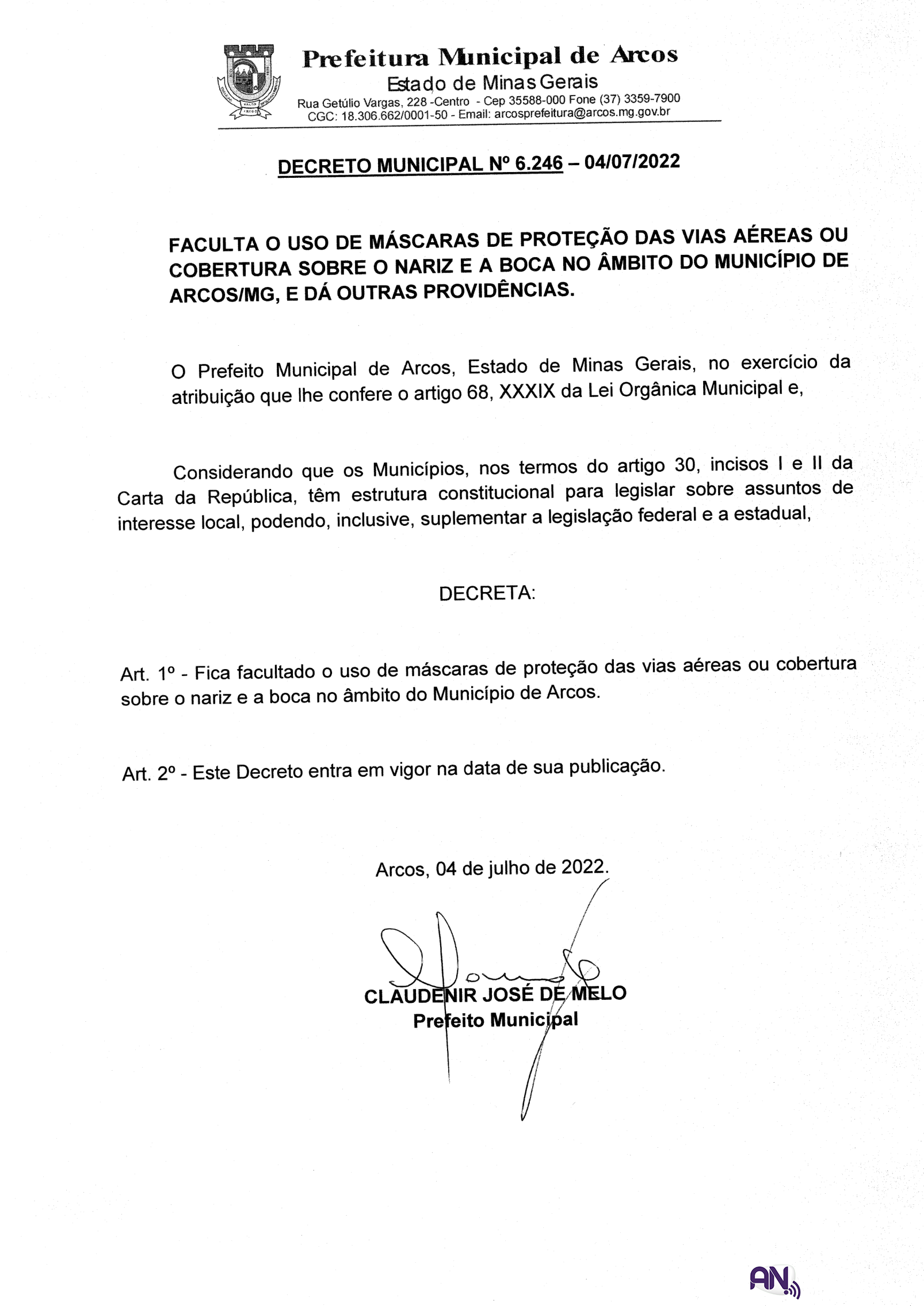 Um decreto publicado na segunda-feira (04) no site da Prefeitura Municipal de Arcos e assinado pelo prefeito, coloca como facultativo o uso de máscaras na cidade de Arcos.