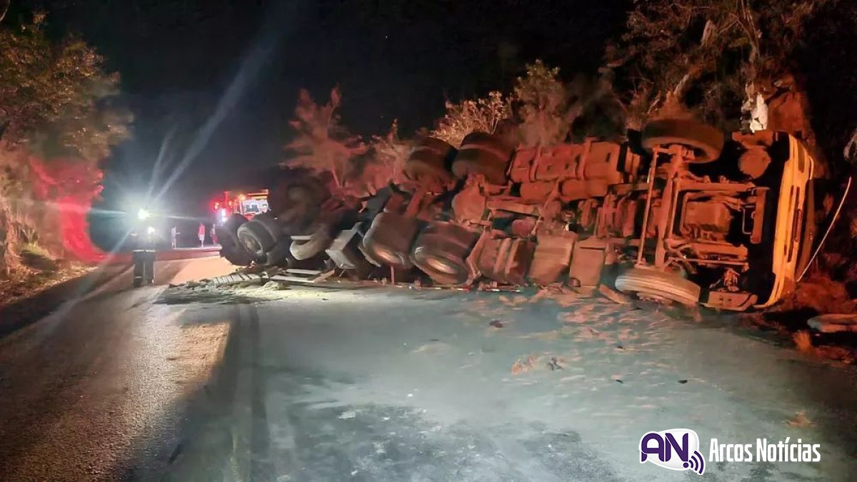 Uma carreta carregada com cimento tombou no km 517 da BR-354, em Formiga, por volta das 18h30 de sábado (30).