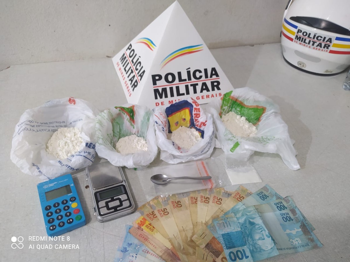 Na casa do cidadão, no bairro Calcita, foram localizados e apreendidos: R$732,00 em cédulas diversas, 4 buchas grandes de cocaína, 01 aparelho celular, 01 máquina de cartão de crédito e 01 balança de precisão. O carro foi removido ao pátio credenciado.