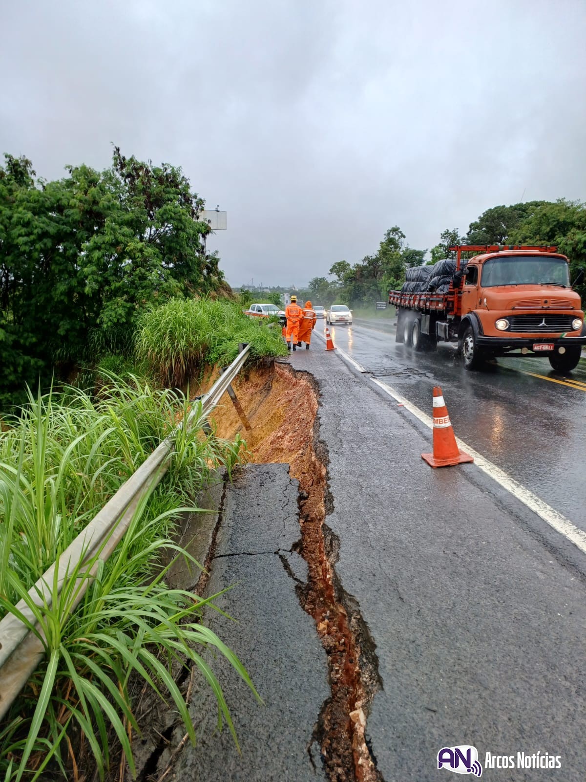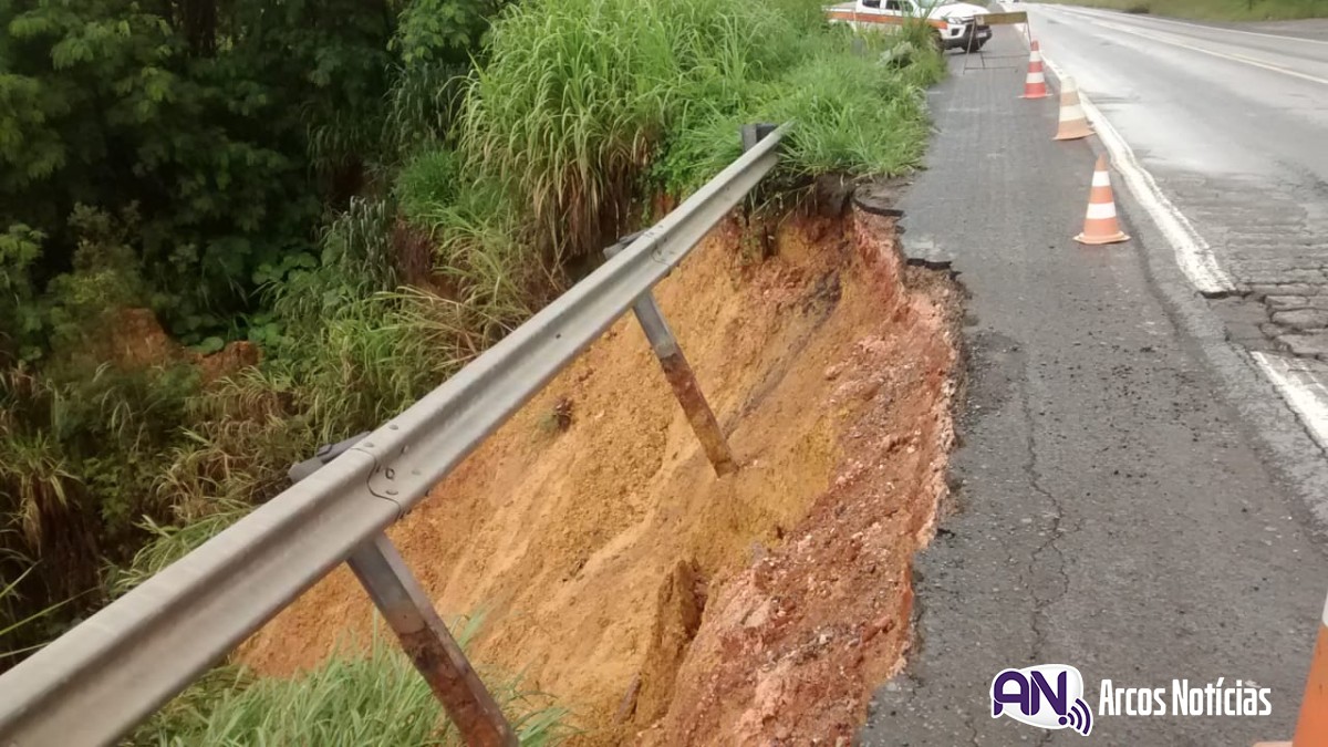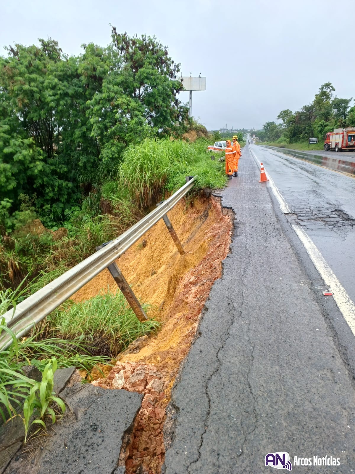 Militares do Corpo de Bombeiros do Posto Avançado de Arcos foram acionados na manhã deste sábado (07), por volta das 11h, para vistoriar um deslizamento de terra no Km 483 da BR-354, em Arcos.