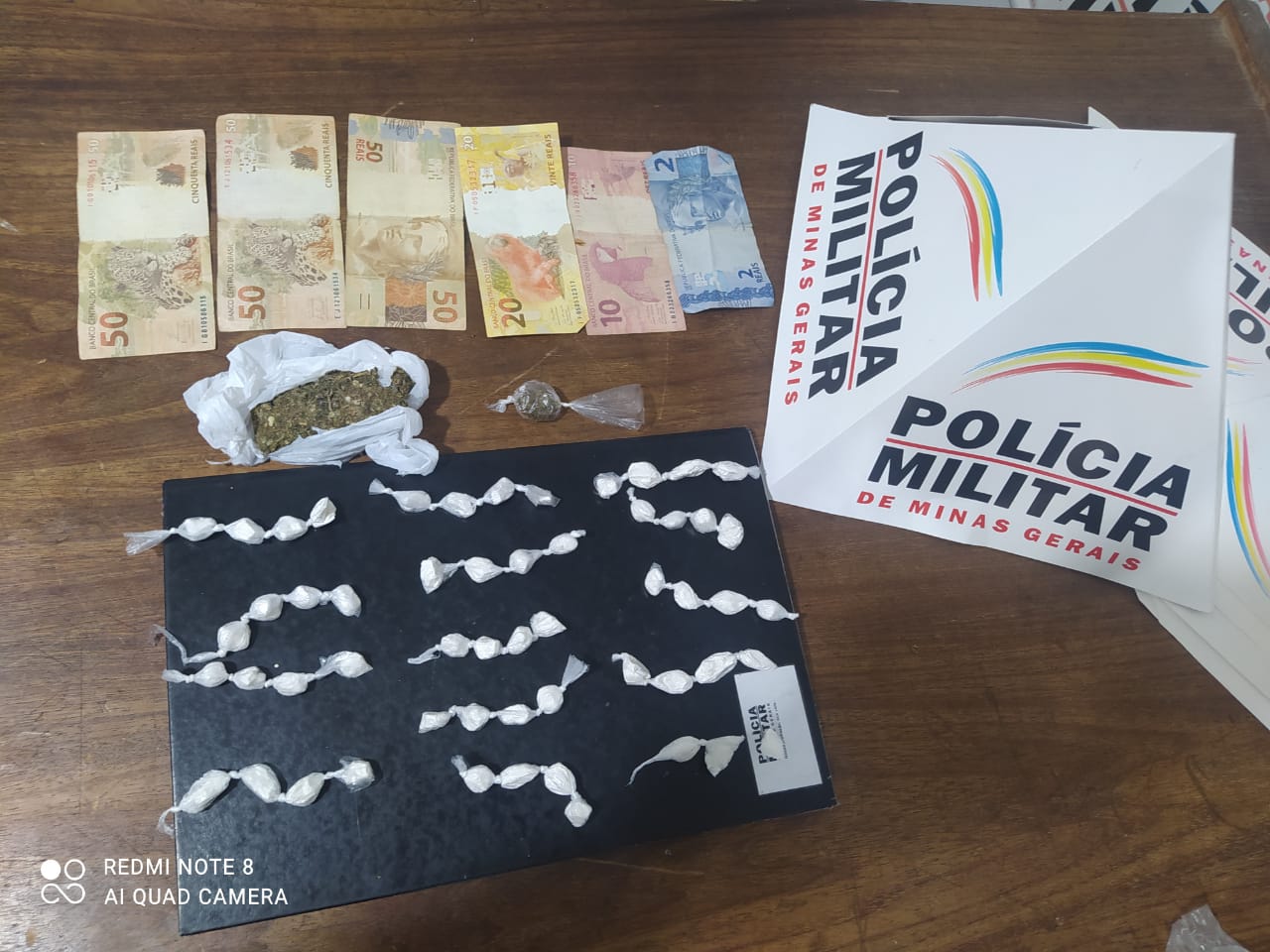 De acordo com a Polícia Militar, durante buscas no veículo, foi localizado, no assoalho, embaixo do tapete, do lado direito do veículo, dois invólucros de plástico contendo cinquenta e cinco papelotes de substância na cor branca análoga a cocaína, uma bucha e um tablete de tamanho maior, de substância análoga a maconha.
